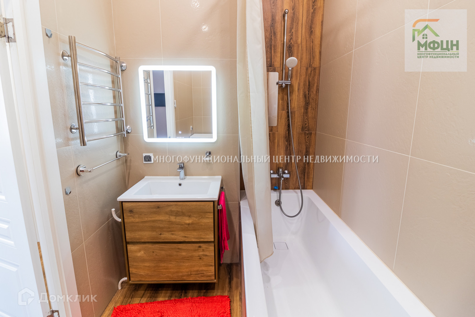 Совмещённый сантехнический узел: теплые полы, встроенный светильник с колонкой подключаемой через Bluetooth.