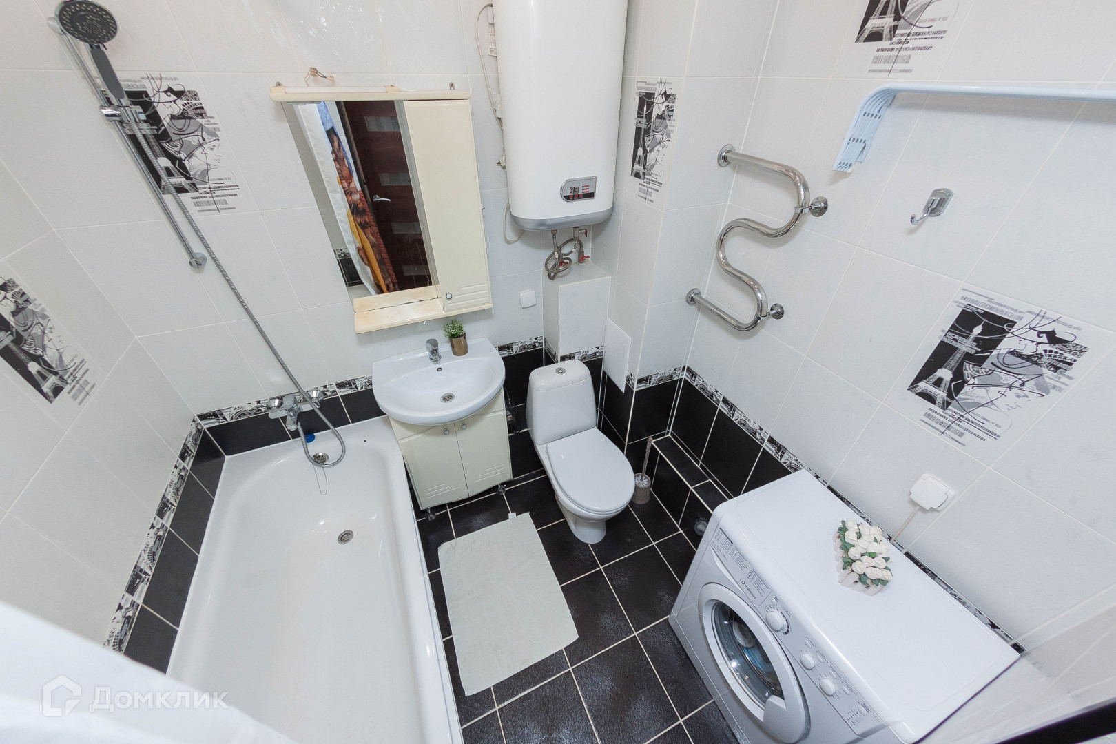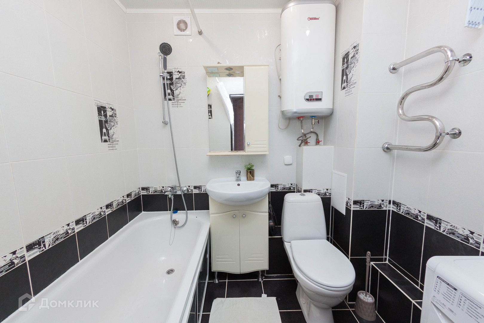 - Просторный совмещенный санузел 3,8 м²., отделка – кафельная плитка (установлен бойлер, остается стиральная машина)