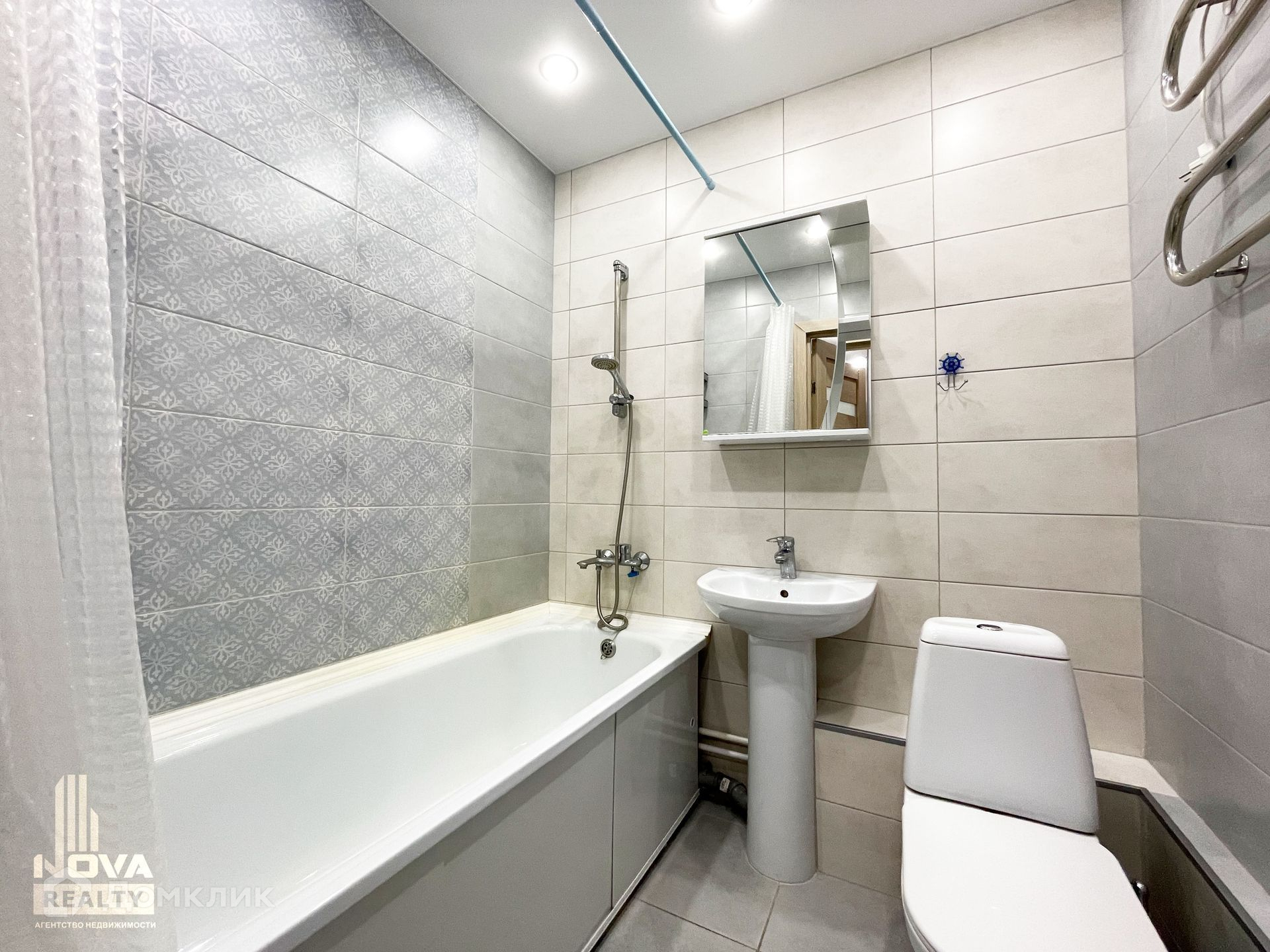 Санузел совмещенный, отделка кафелем, установлена сантехника, счетчики на воду, полотенцесушитель.