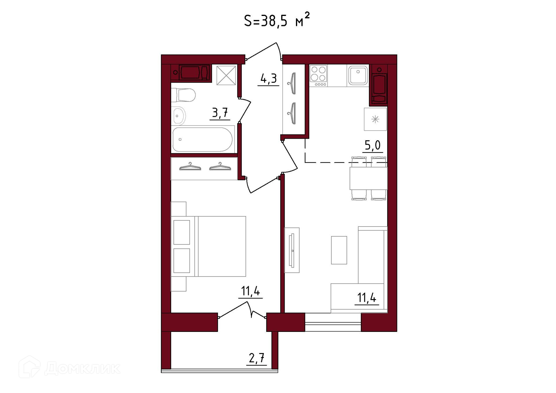 Общая площадь 39 кв.м (включая лоджию 2,7 кв.м)