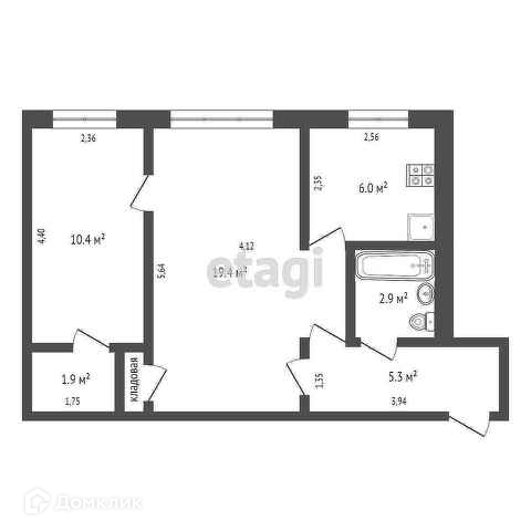 - Общая площадь квартиры составляет 46,4 кв.м, две комнаты 19.4 и 10.4 кв.м. Площадь кухни 6 кв.м.