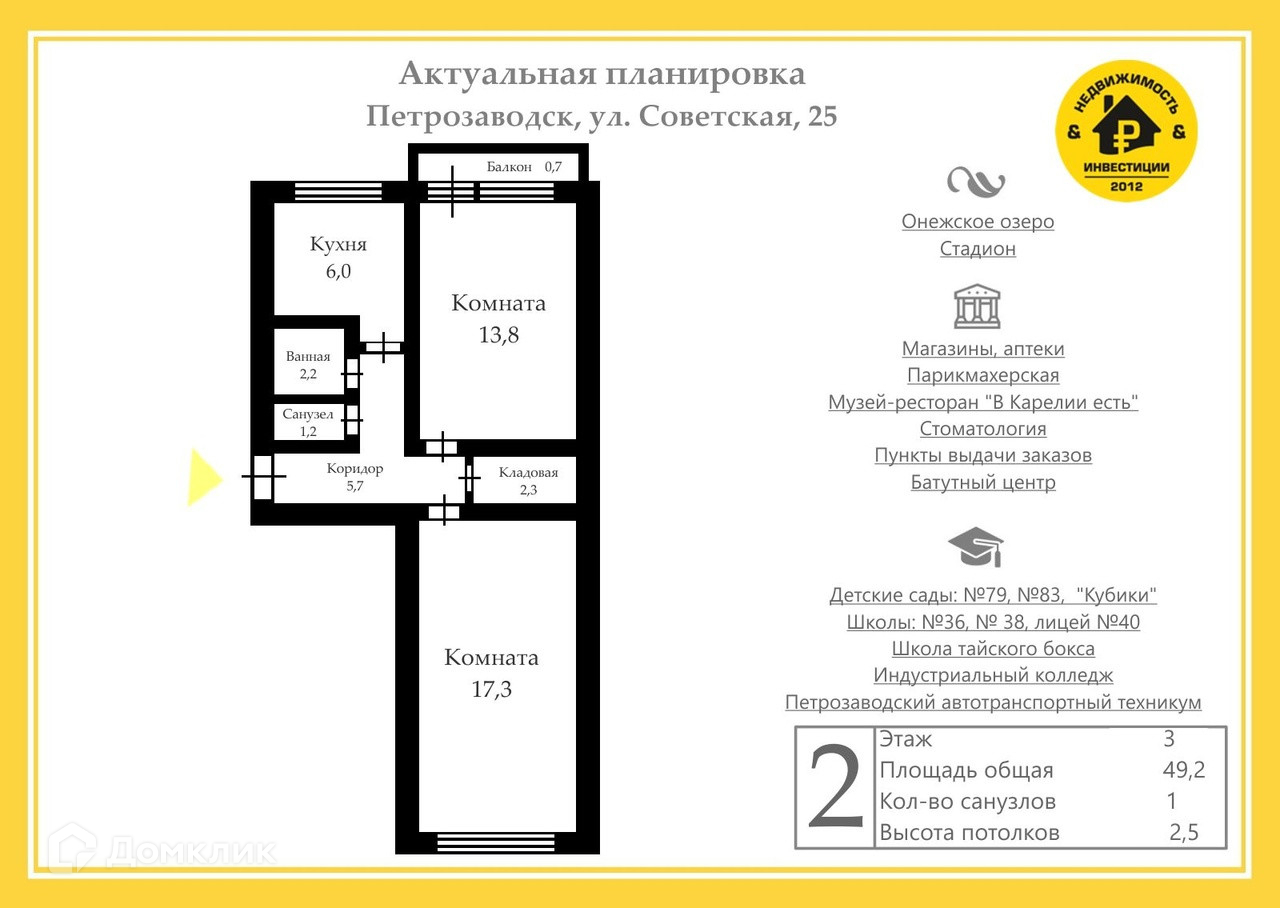 2-комнатная квартира, 49.2 м2, этаж 3 / 5, на продажу в Петрозаводске, Советская улица, 25