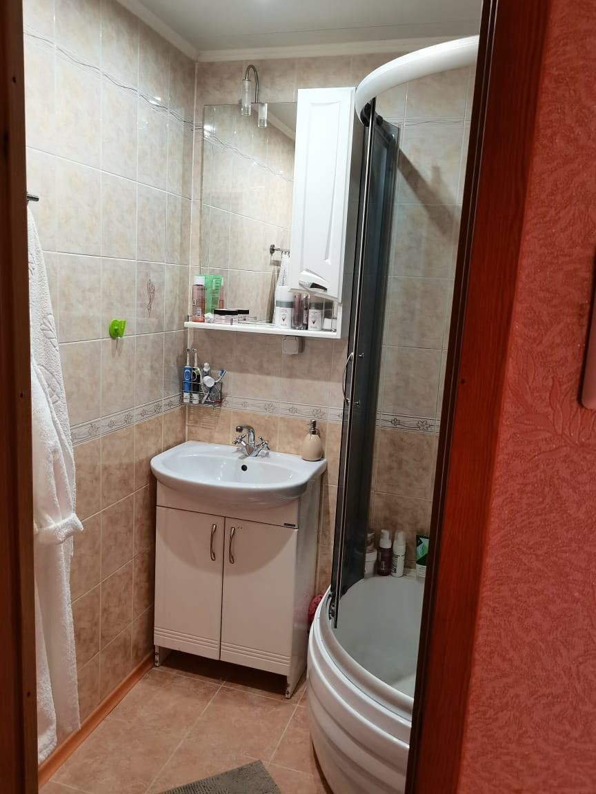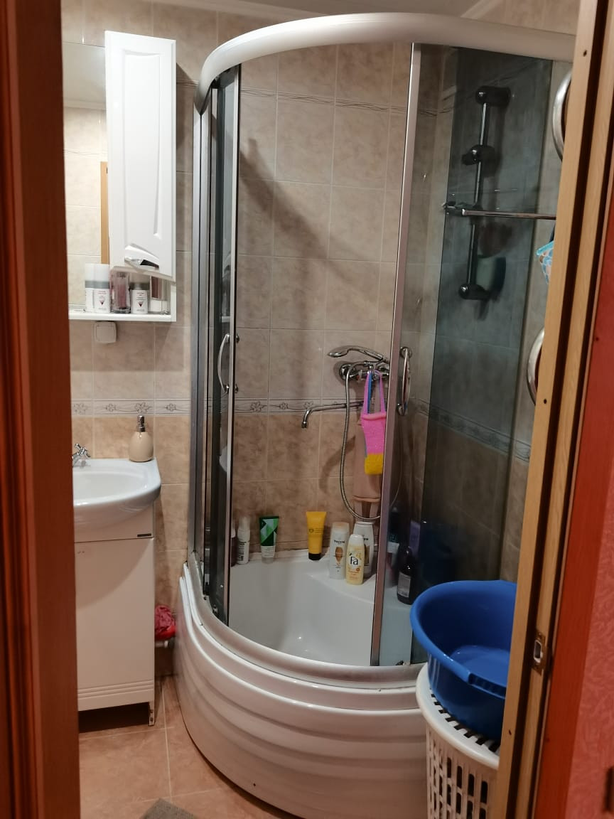 Санузел раздельный, кафель, установлена сантехника, душевая кабина, счетчики на воду.