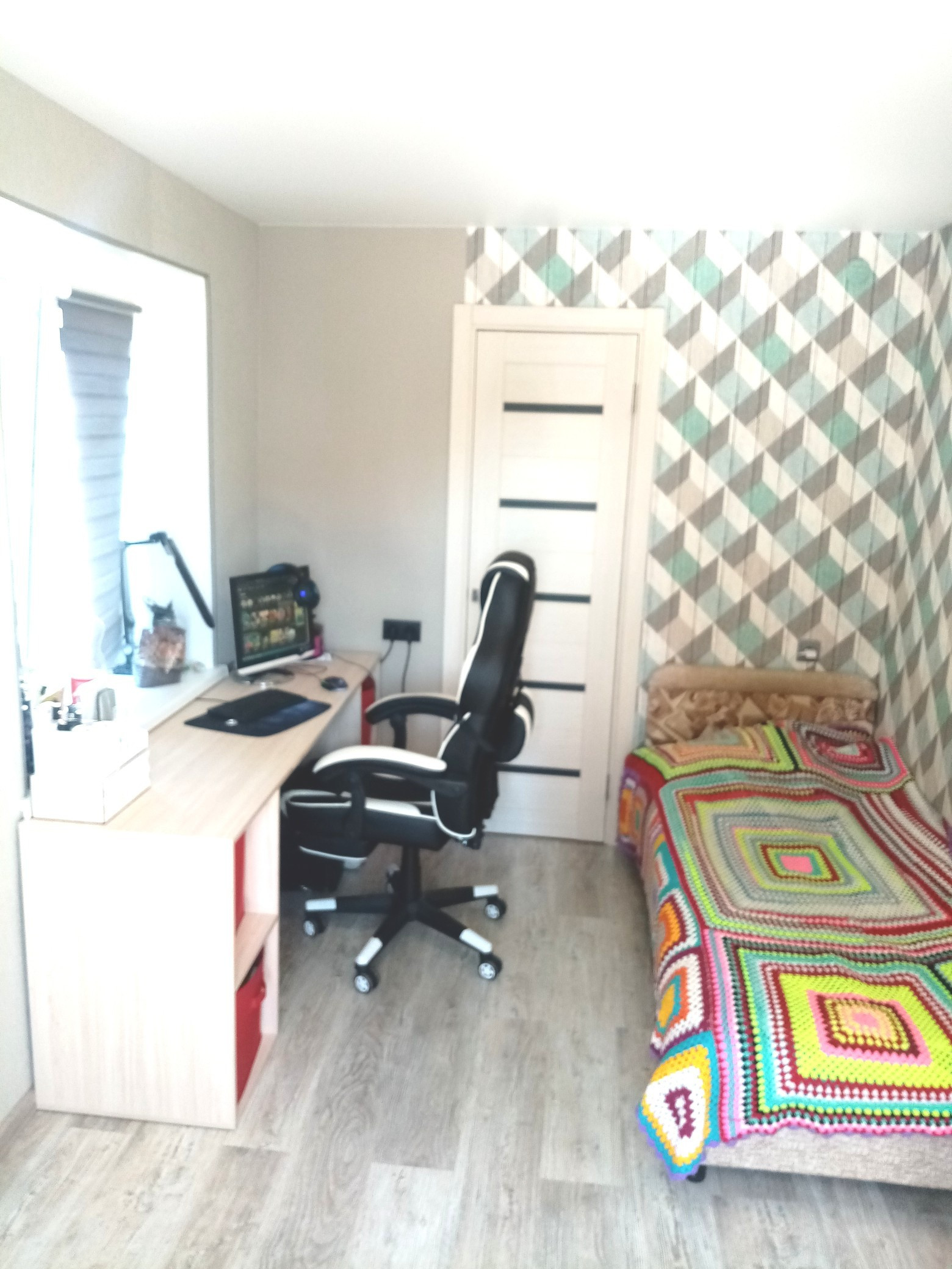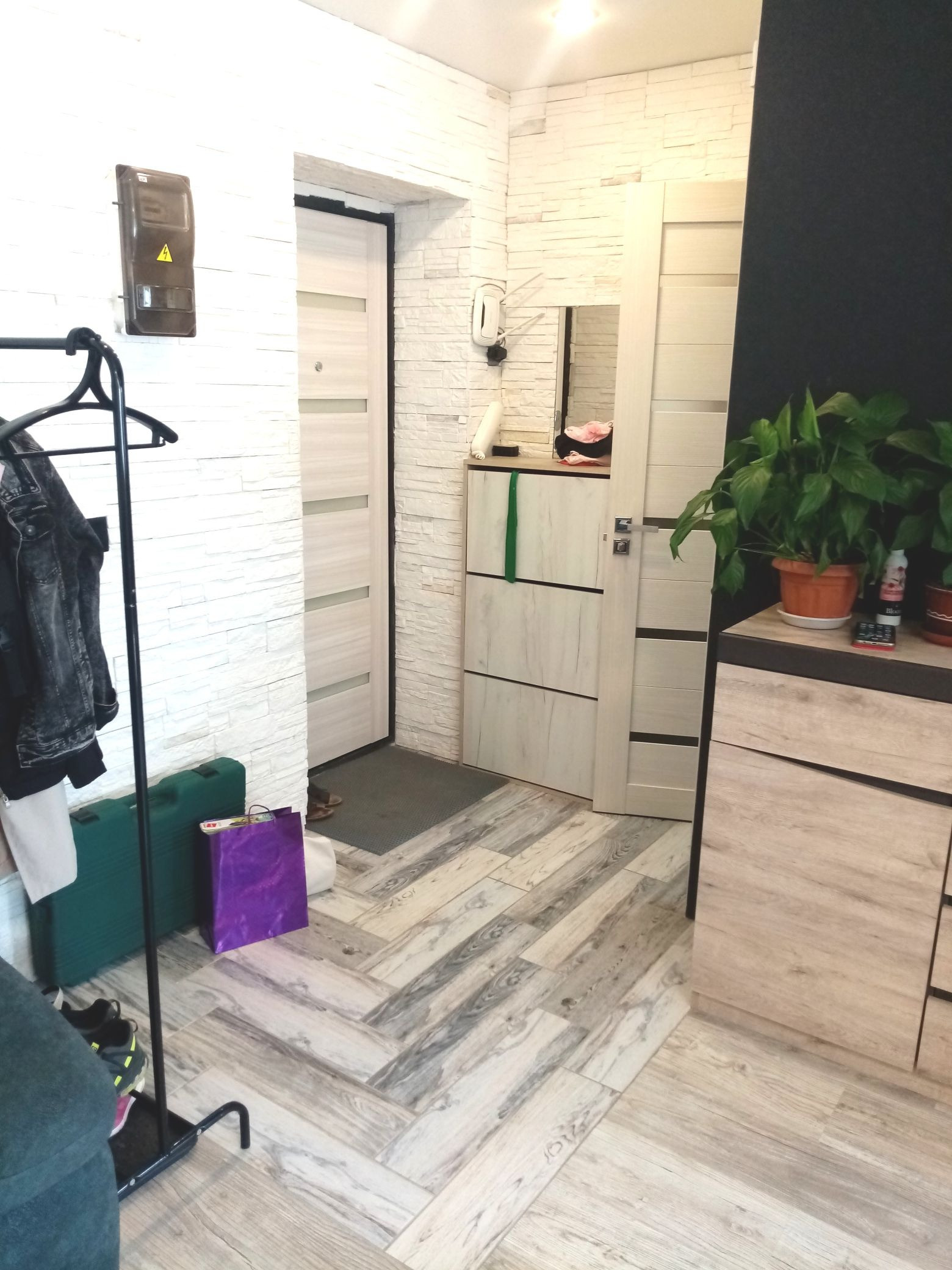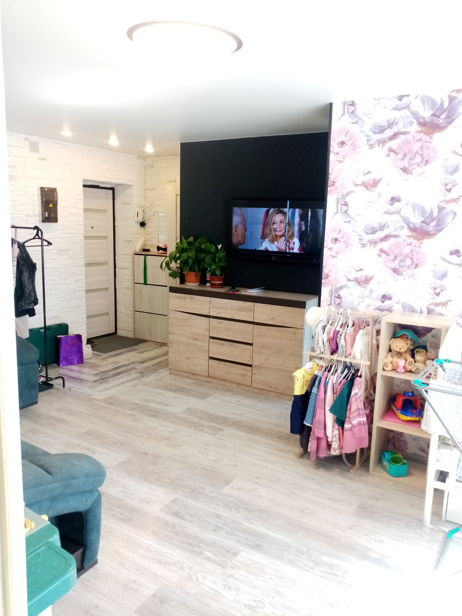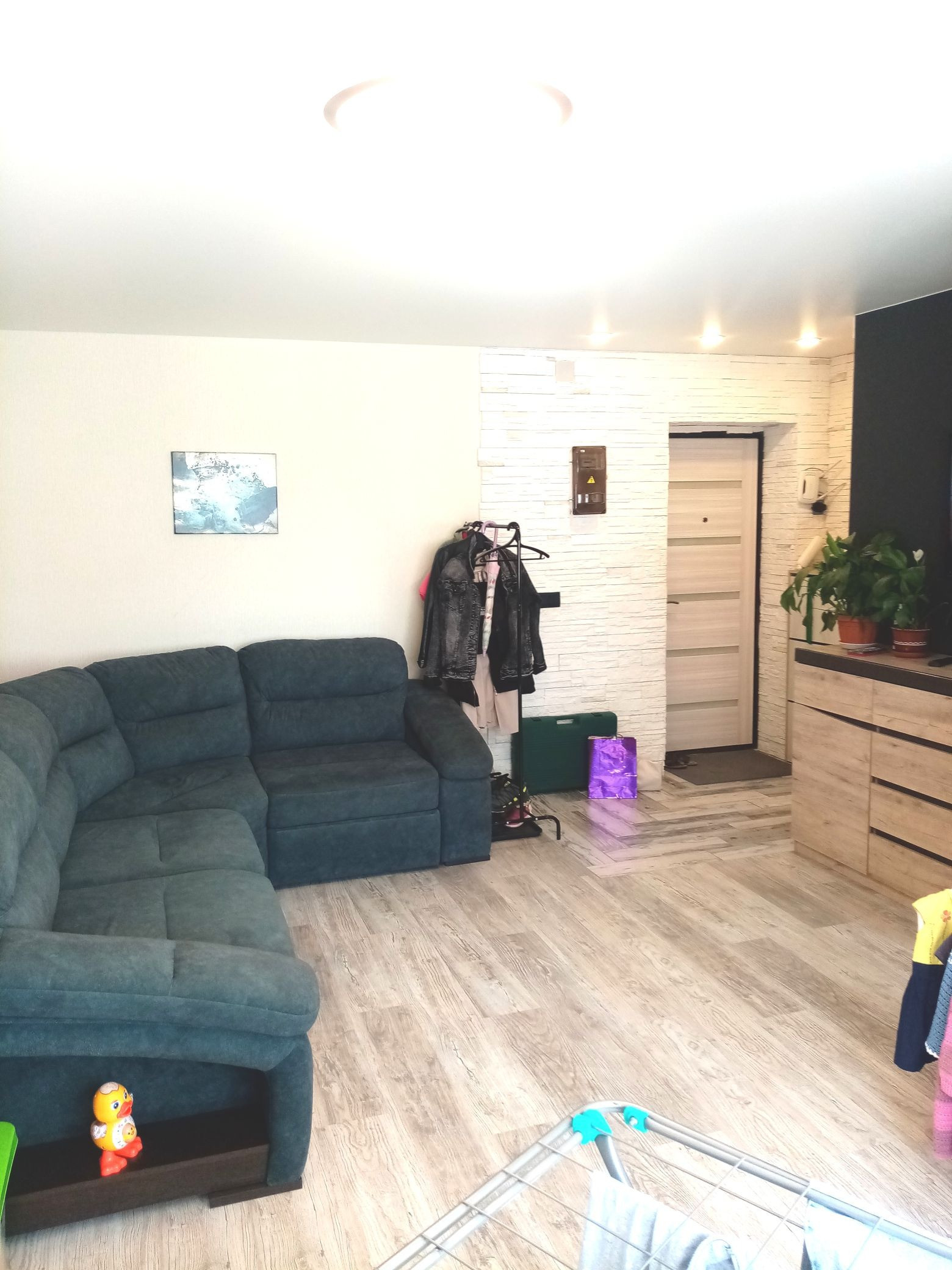 В квартире сделан качественный ремонт: окна стеклопакеты, пол ламинат, плитка, натяжные потолки, замена электропроводки по всей площади. Санузел совмещен, кафель, новая сантехника. Остаётся встроенная кухня. В квартире центральное горячее водоснабжение, природный газ. Комнаты 18 и 11 кв. м, есть гардеробная 1.90 кв.м.