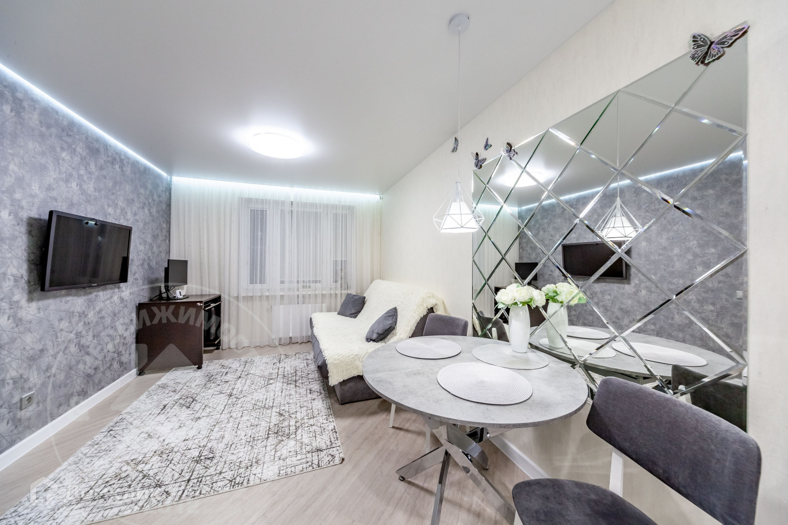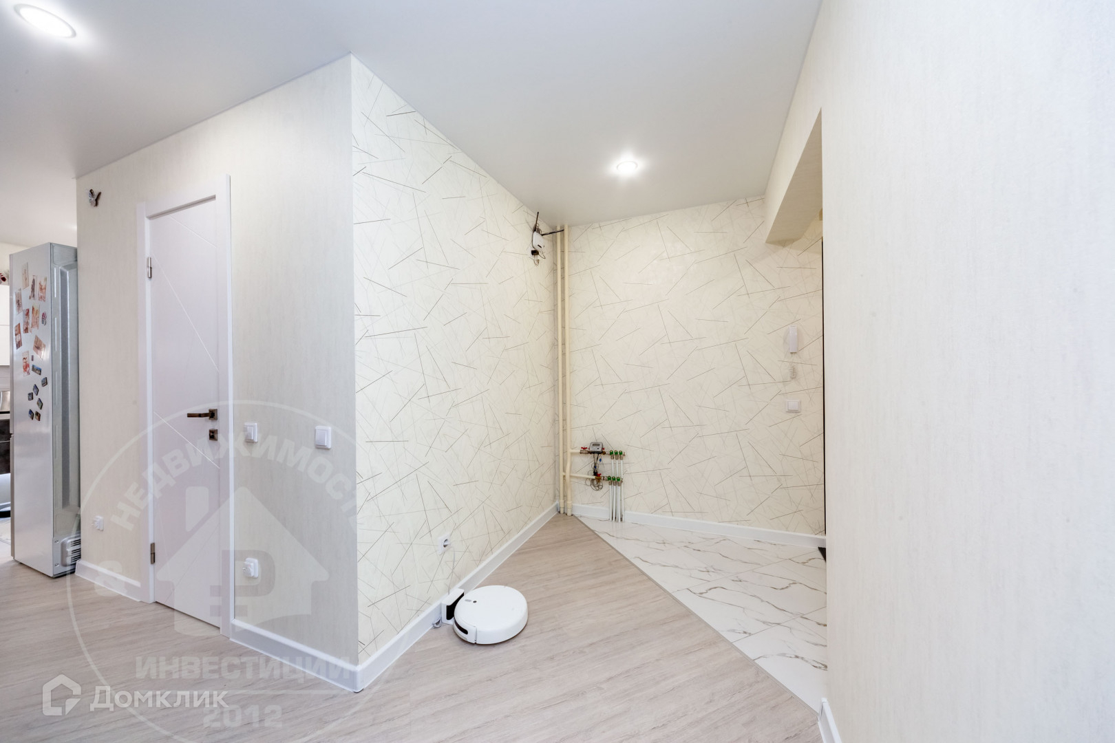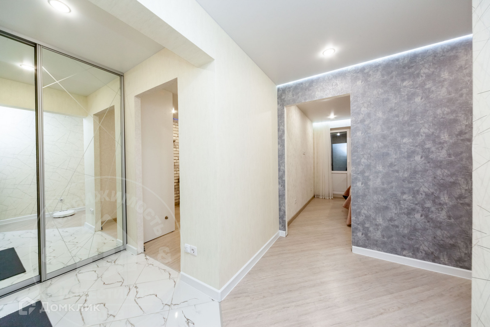 В квартире выполнен качественный ремонт, сделана шумоизоляция: потолки, пол, в ванной комнате шумоизоляция инженерных коммуникаций. Натяжные потолки, теплый пол на кухне, в гардеробной и прихожей, в ванной комнате и в душевой кабине. На кухне и в прихожей напольное покрытие - плитка. В гостиной, детской и спальне на полу постелен ламинат. Оборудована гардеробная и системы хранения.