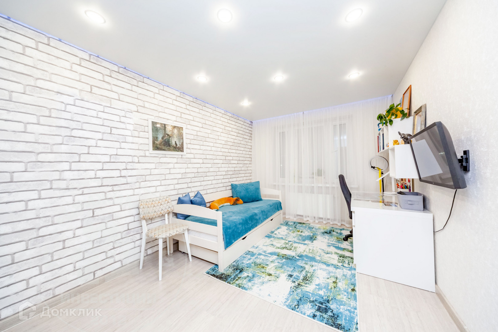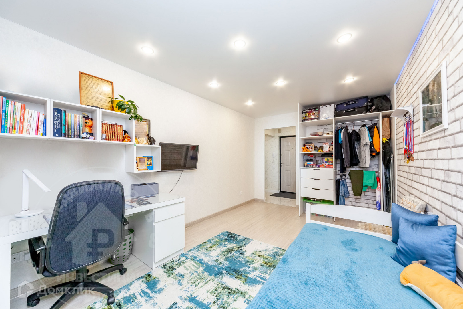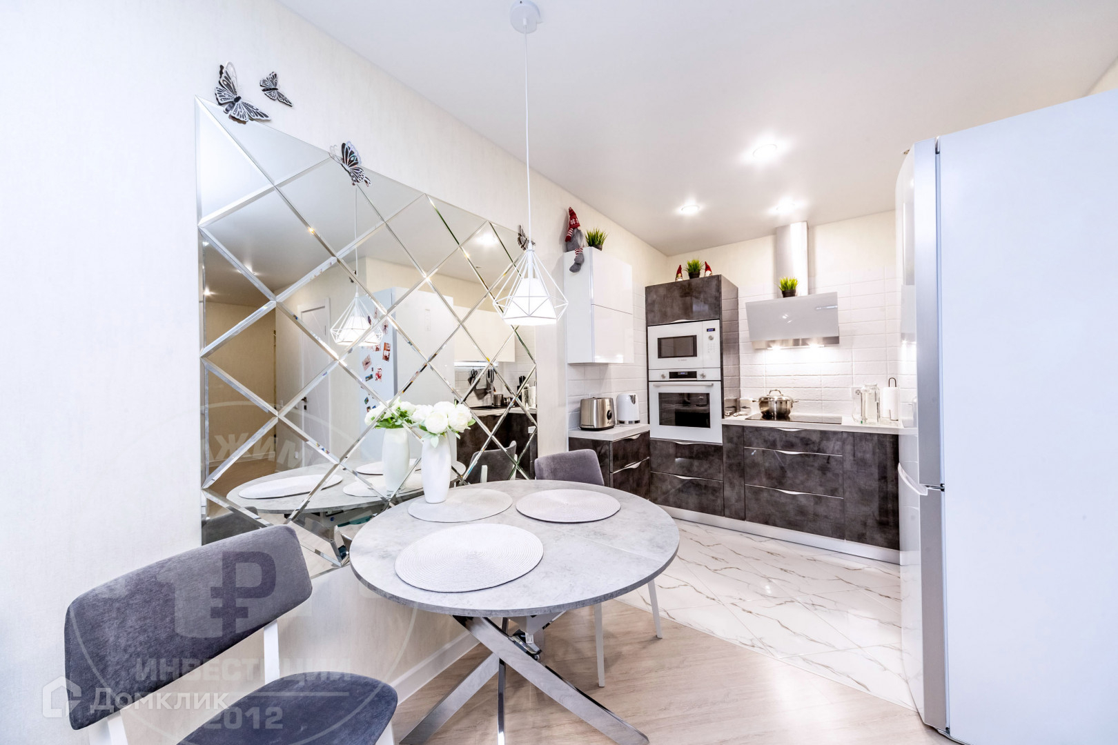 В квартире выполнен качественный ремонт, сделана шумоизоляция: потолки, пол, в ванной комнате шумоизоляция инженерных коммуникаций. Натяжные потолки, теплый пол на кухне, в гардеробной и прихожей, в ванной комнате и в душевой кабине. На кухне и в прихожей напольное покрытие - плитка. В гостиной, детской и спальне на полу постелен ламинат. Оборудована гардеробная и системы хранения.
