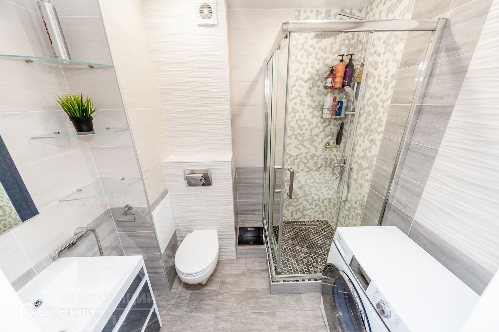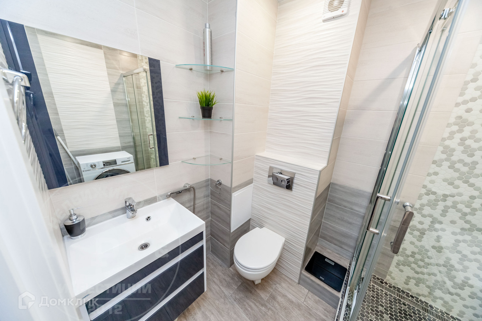 В ванной комнате стены и напольное покрытие из керамической плитки, душевая кабина выполнена из керамической мозаичной плитки и распашных дверей из стекла.