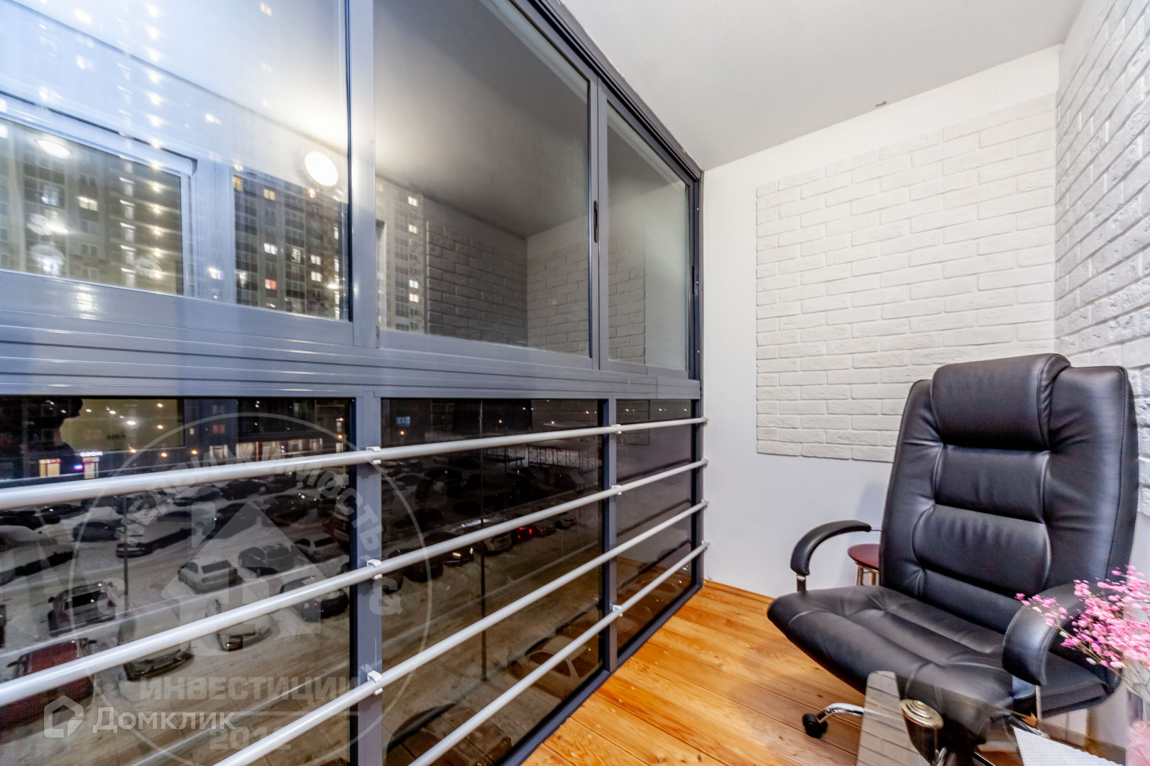 Напольное покрытие на балконе выполнено из террасной доски.