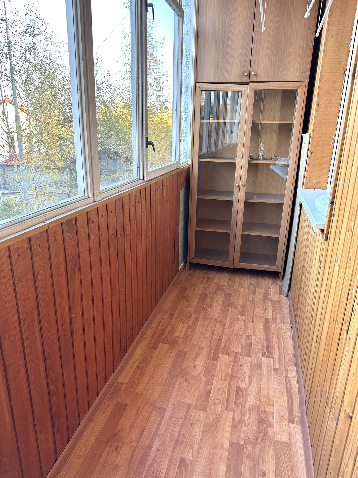 Заст. лоджия 6,8 м2, обшита вагонкой, оборудована шкафами, на полу ламинат