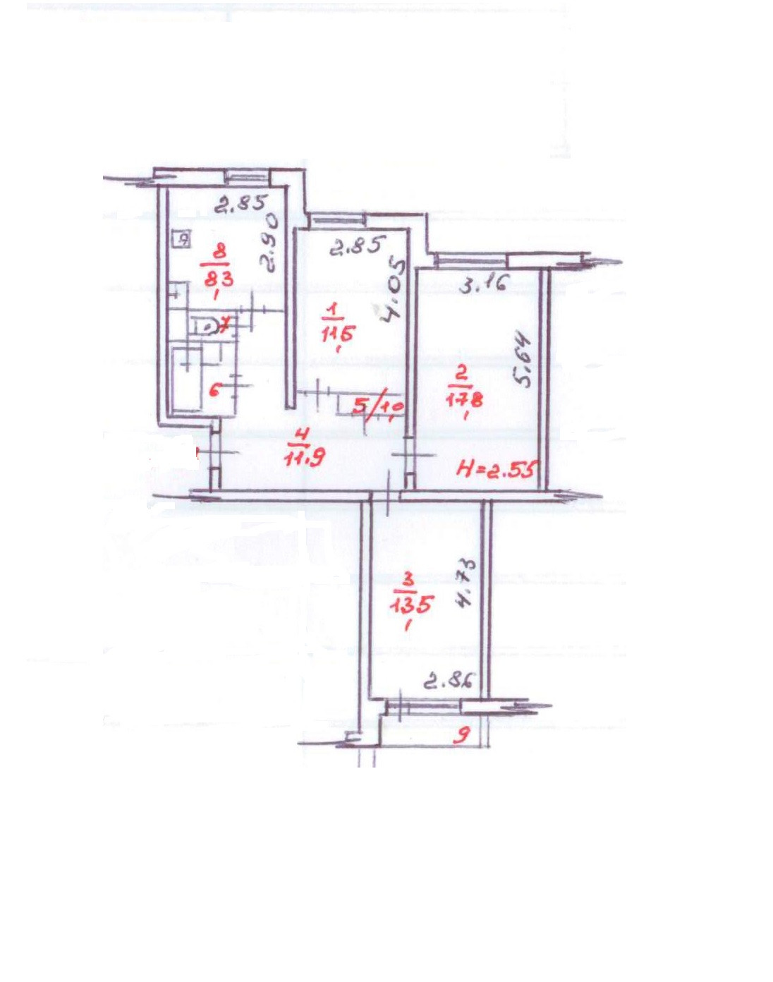 Комнаты - 11,5/17,8/13,5 кв.м.