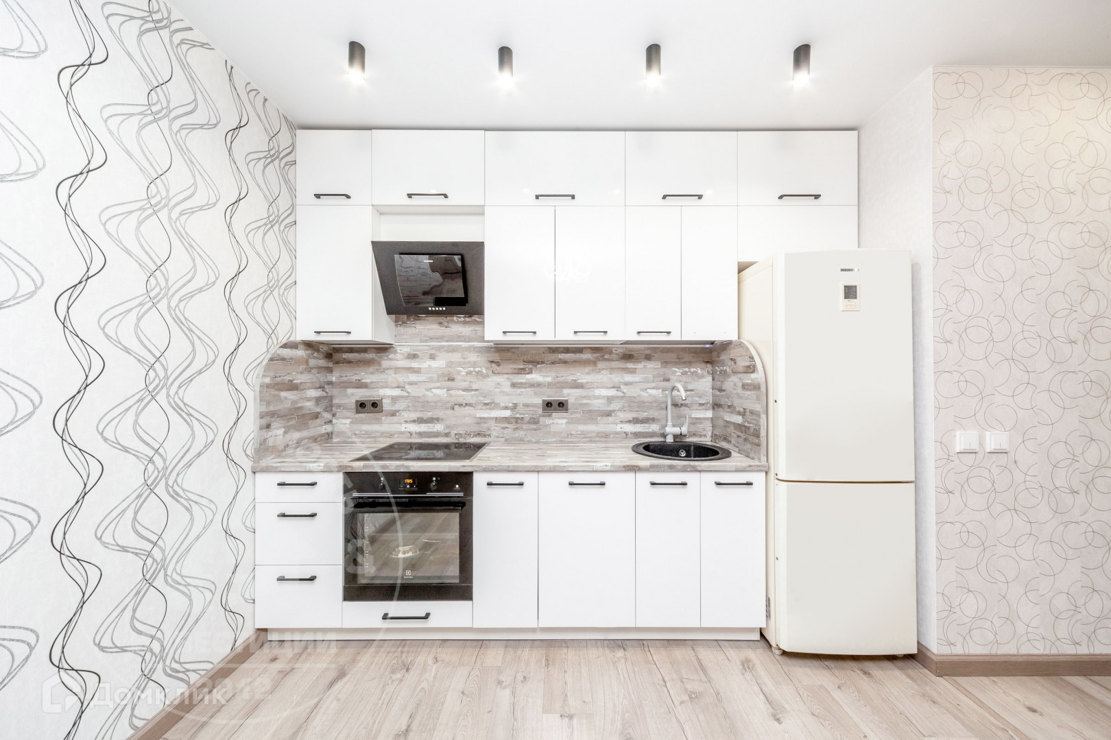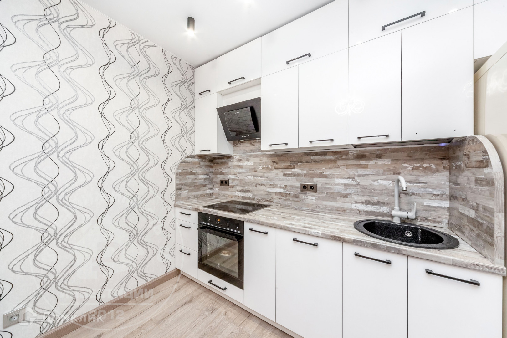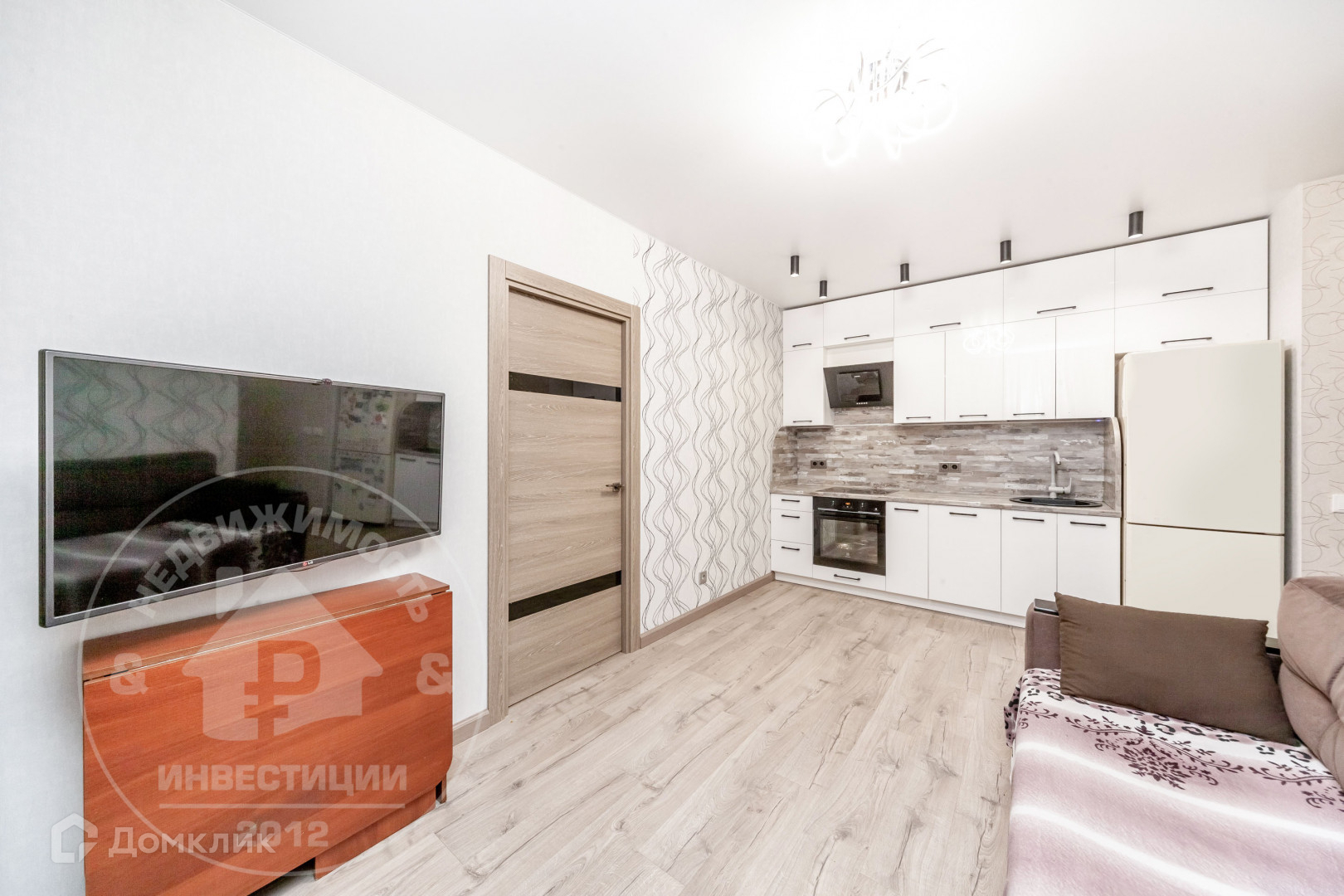 Просторная гостиная - кухня, со встроенным и полностью оборудованным кухонным гарнитуром (пластиковые фасады и немецкая фурнитура).