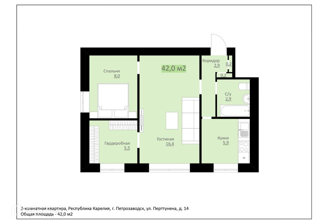 2-комнатная квартира, 42.3 м2, этаж 1 / 5, на продажу в Петрозаводске, улица Перттунена, 14
