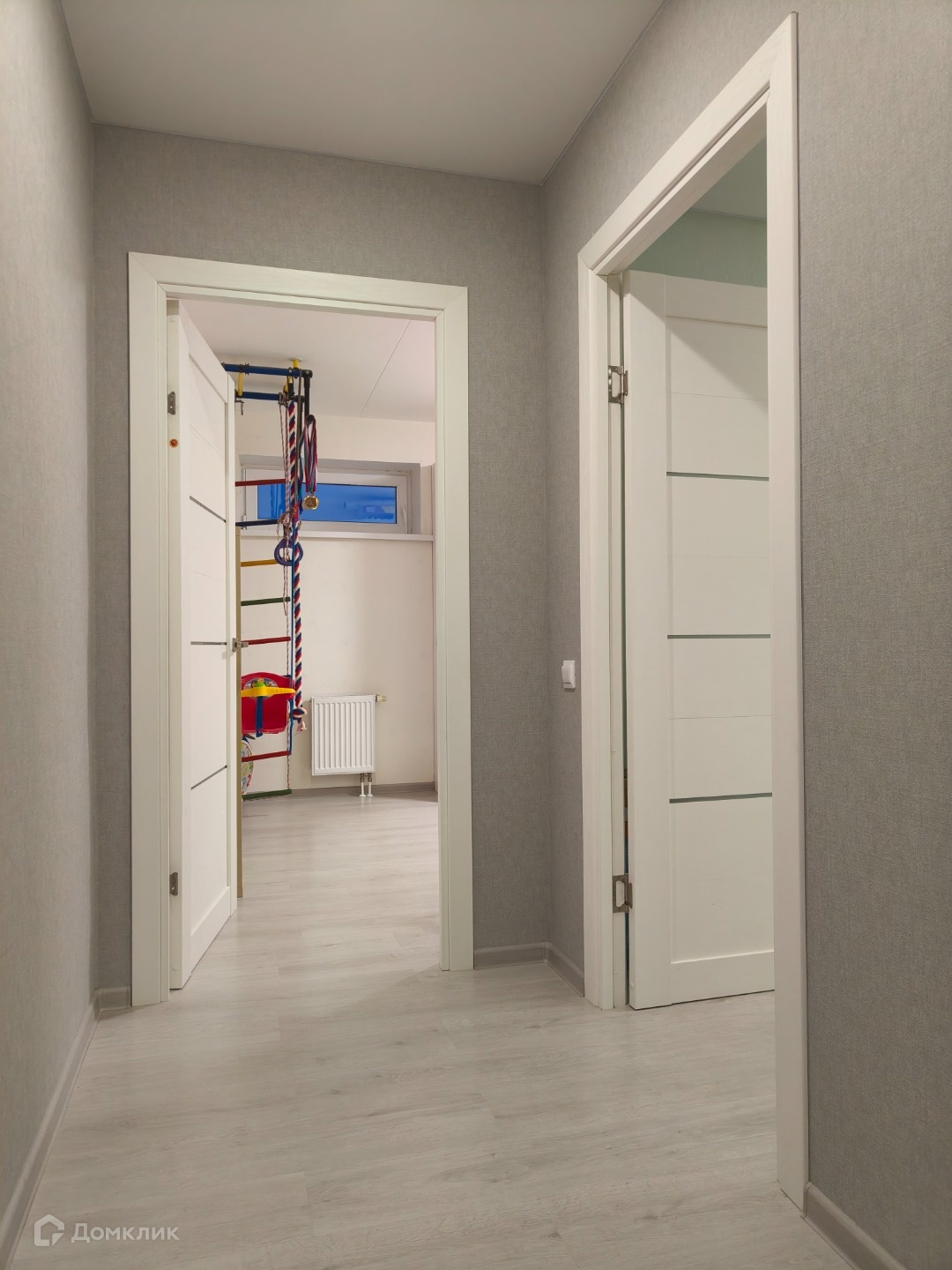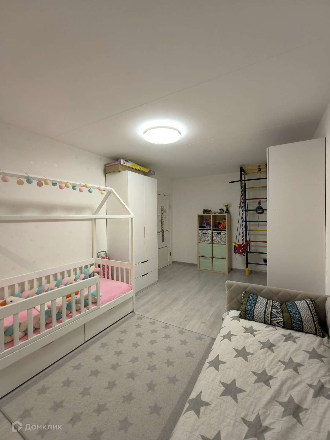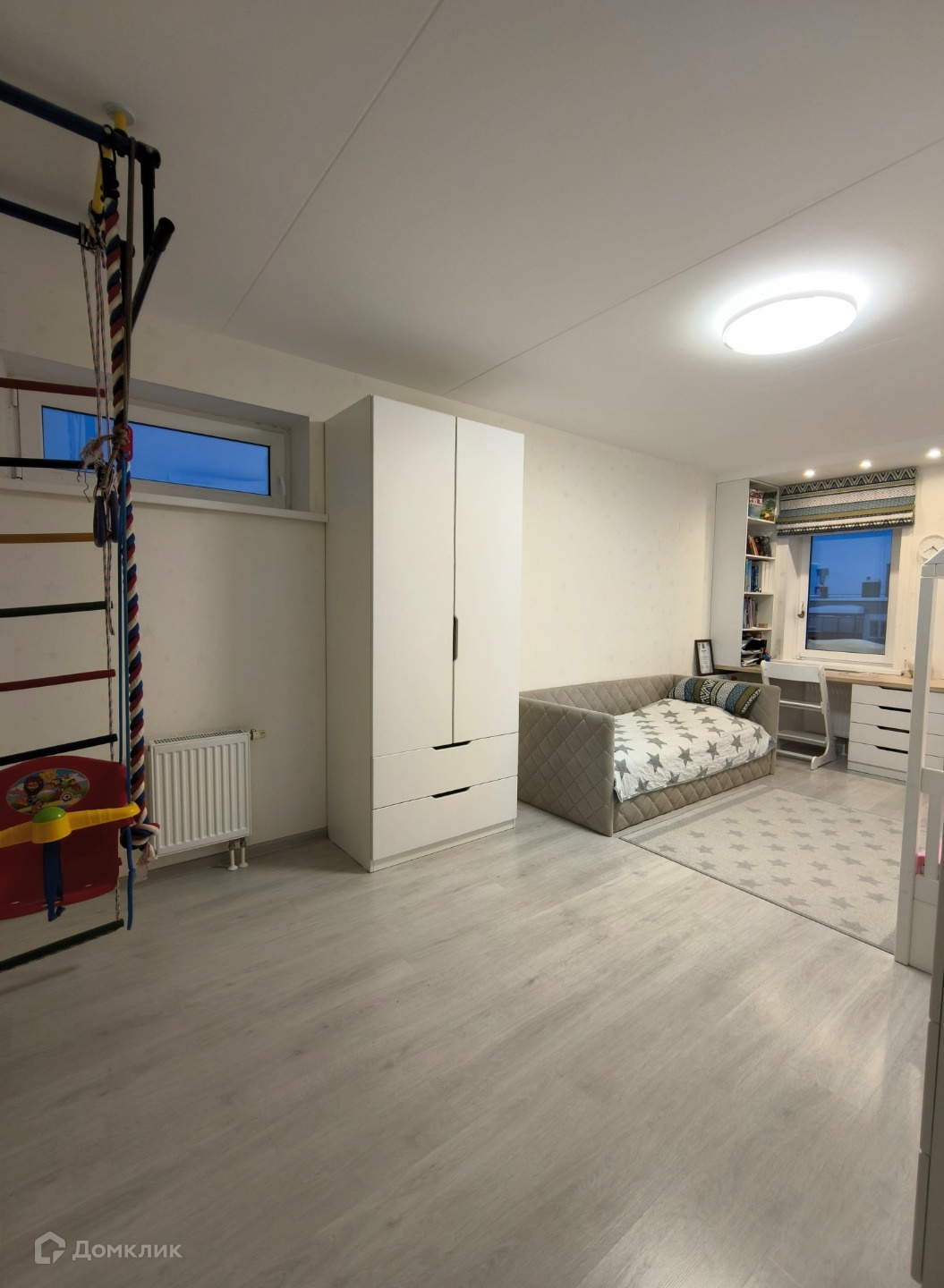 - из мебели и техники остаётся: кухонный гарнитур со встроенной техникой (посудомоечная машина, варочная поверхность, духовой шкаф, вытяжка), водонагреватель, встроенные шкафы в прихожей, спальне, ванной, в детской комнате рабочая зона для двоих деток (письменные столы, стеллажи), детский спортивный уголок