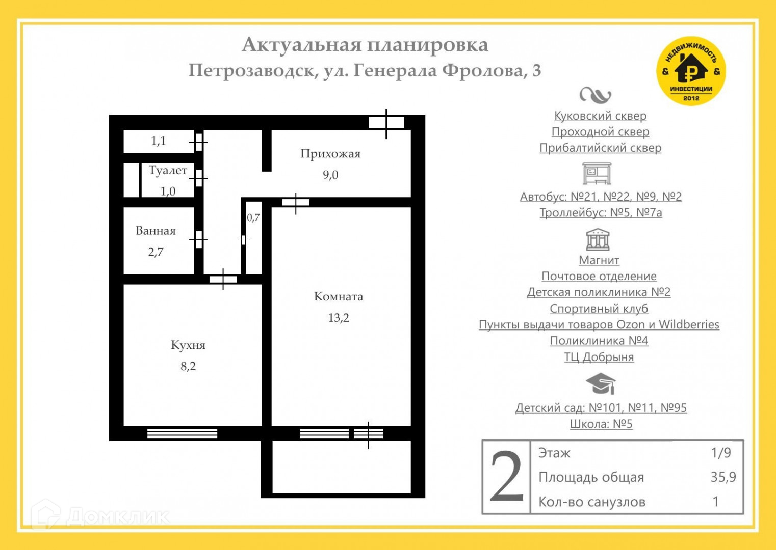 1-комнатная квартира, 36 м2, этаж 1 / 9, на продажу в Петрозаводске, улица Генерала Фролова, 3
