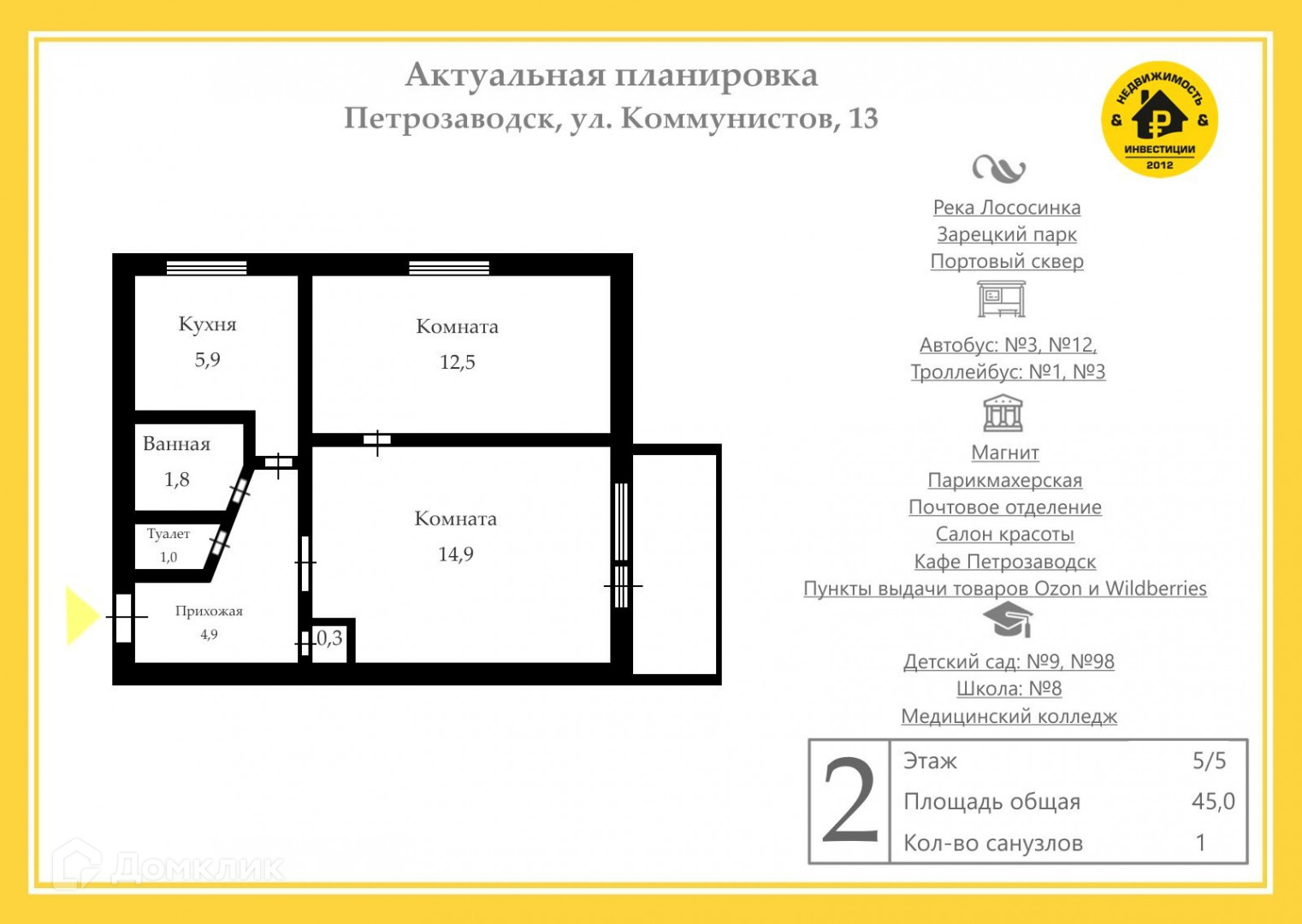 2-комнатная квартира, 45 м2, этаж 5 / 5, на продажу в Петрозаводске, улица Коммунистов, 13А