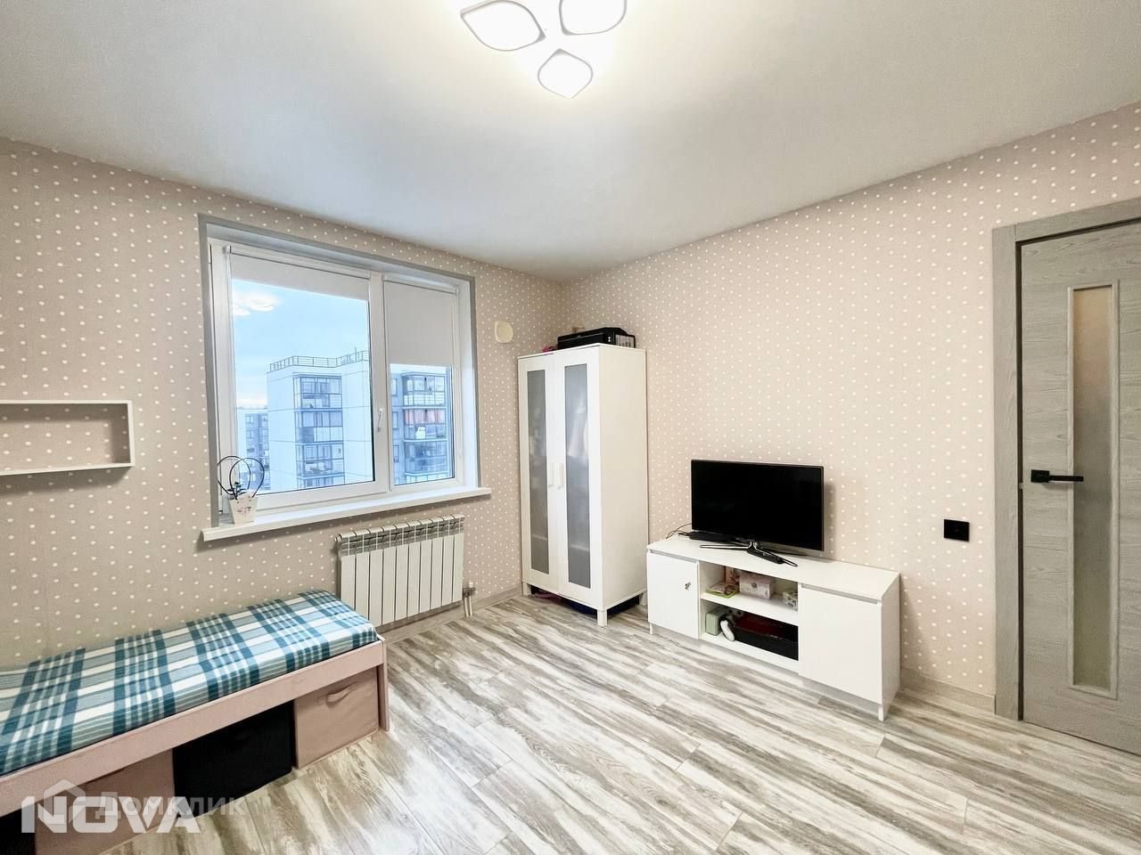 Новым хозяевам остается все необходимое для комфортного проживания: кухонный гарнитур, варочная поверхность, духовой шкаф, холодильник, микроволновка, вытяжка, стол и стулья в кухне, обувница, детская мебель в детской, диван и стенка в гостиной, телевизор.
