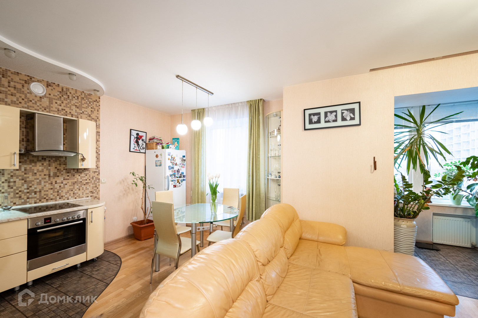 Квартира состоит из просторной кухни-гостиной с эркером, двух спален, в каждой из которых есть лоджия, а в одной из спален отдельный санузел. В основной ванной комнате установлена душевая кабина и большая угловая ванна.