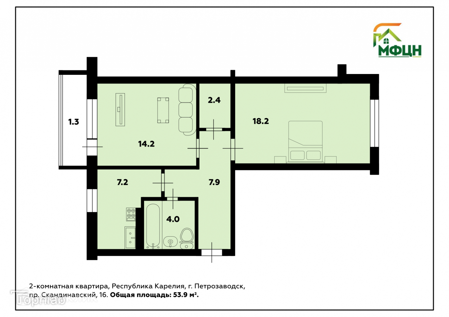 Общая площадь 53.9 м2