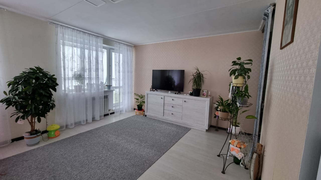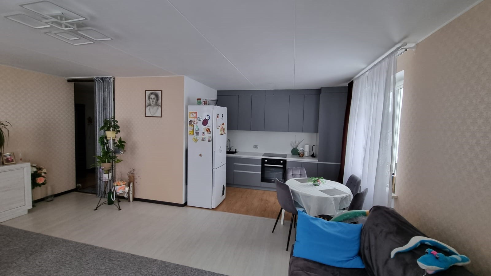 Гостиная комната: напольное покрытие качественный ламинат, моющие обои, выровненные потолки и окрашены водоэмульсионной краской с выходом на балкон.