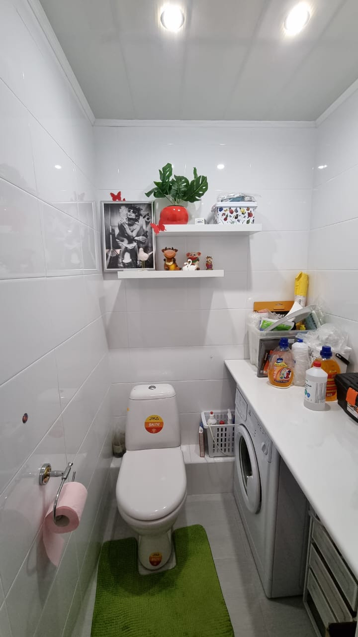 Ванна с санузлом: раздельные и находятся противоположно друг к другу в прихожей, стены и полы отделаны плиткой, потолки отделаны панелями + точечное освещение, в санузле установлена стиральная машинка.