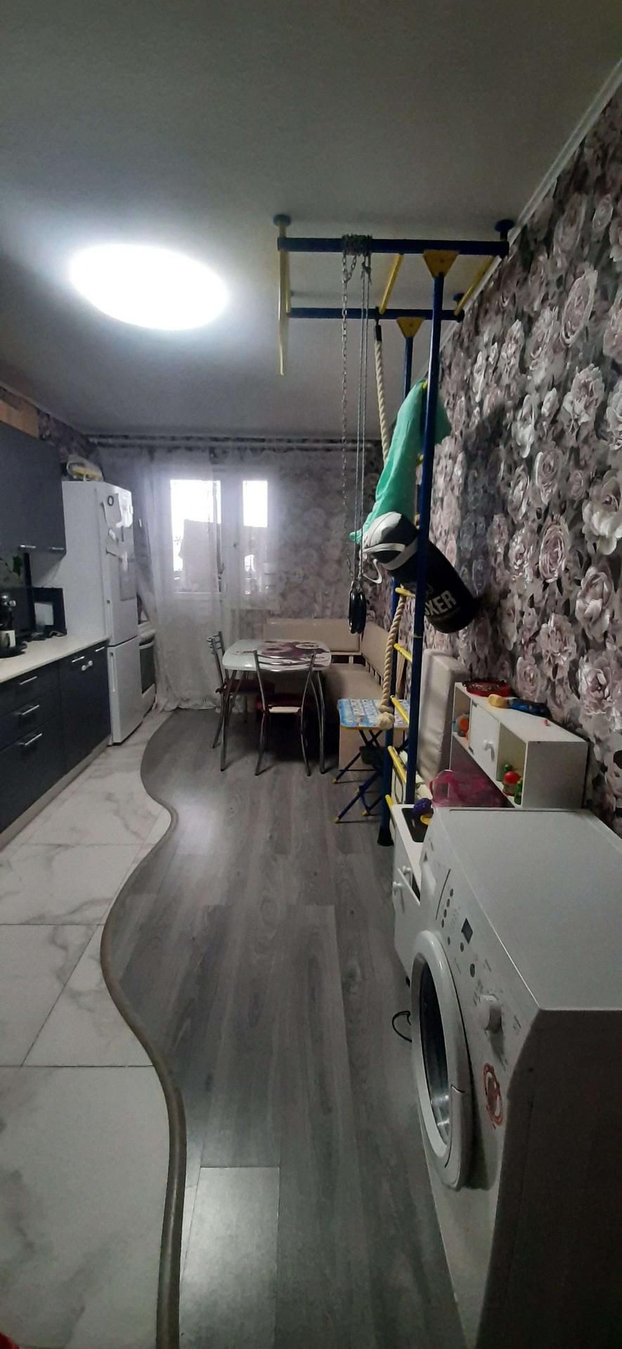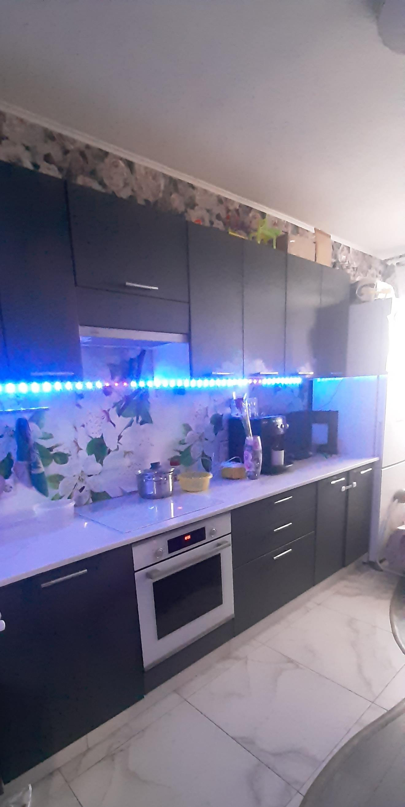 На кухне пол-керамогранит и ламинат 33 класс,светодиодный светильник на потолке с регулировкой освещения.