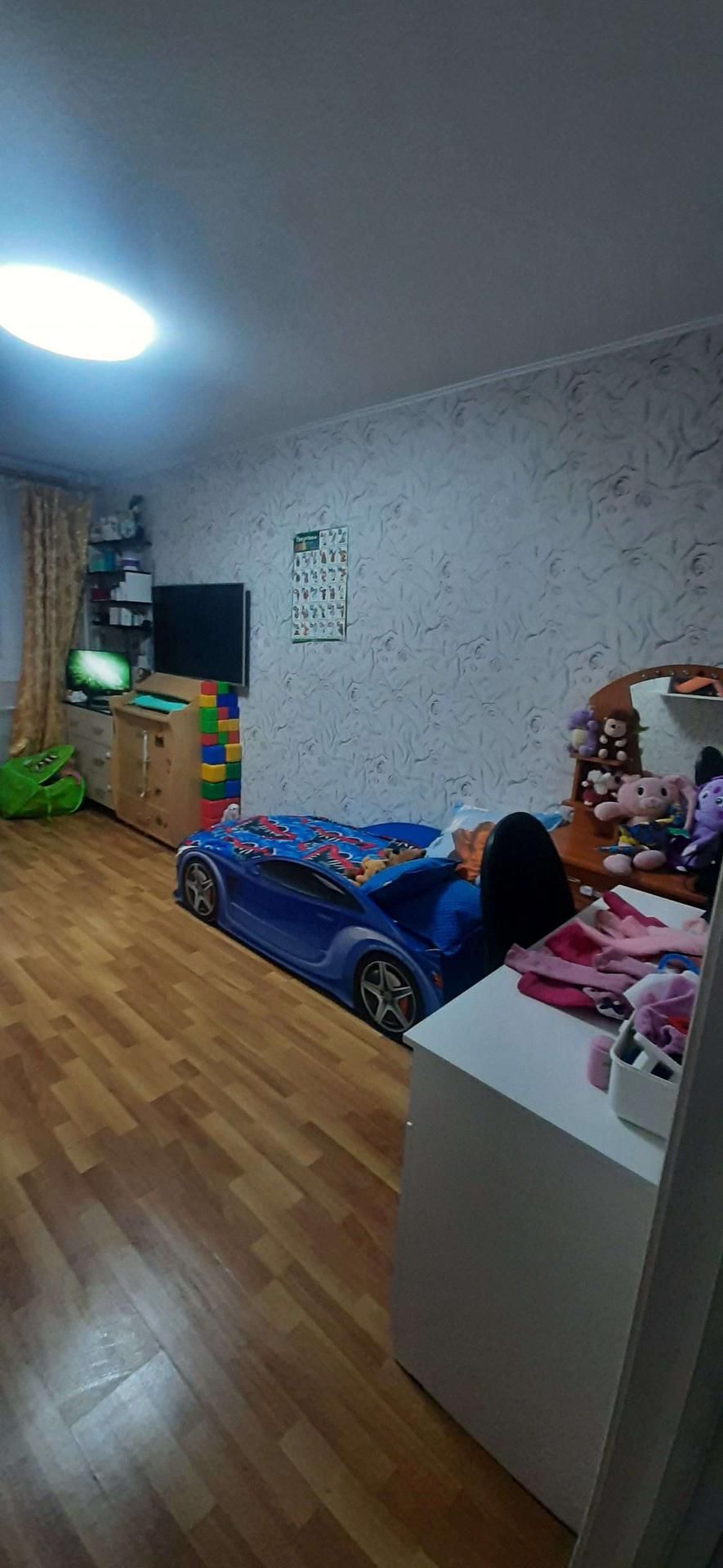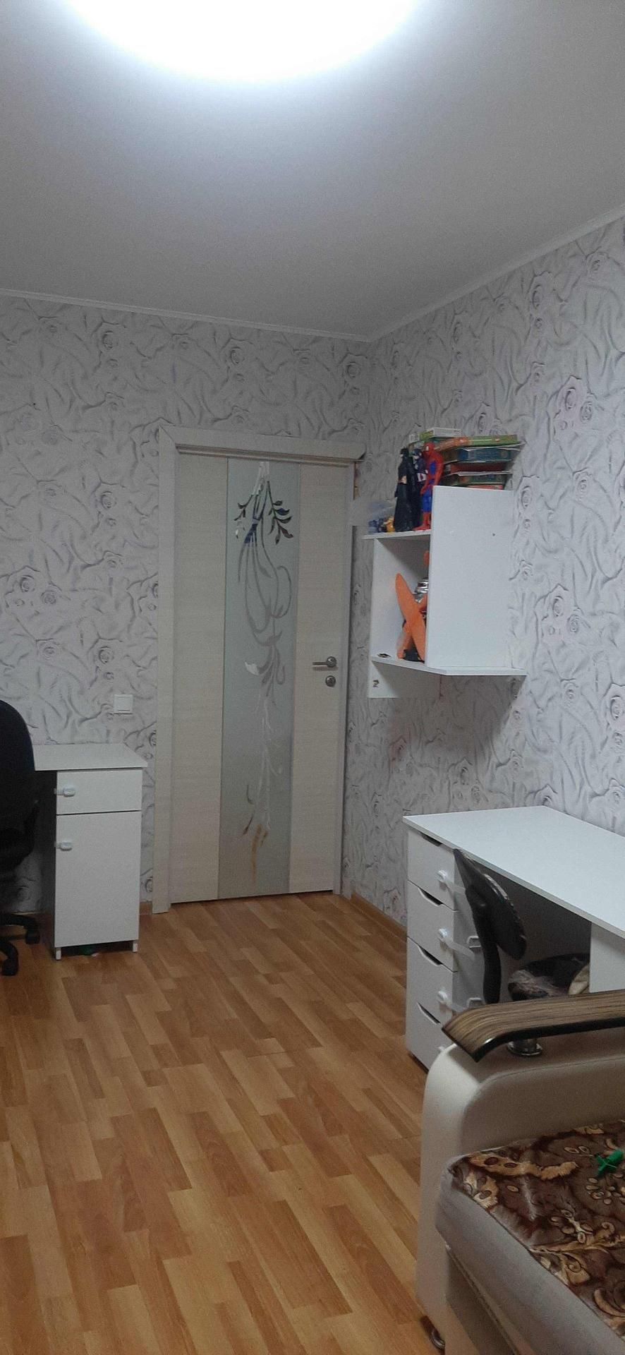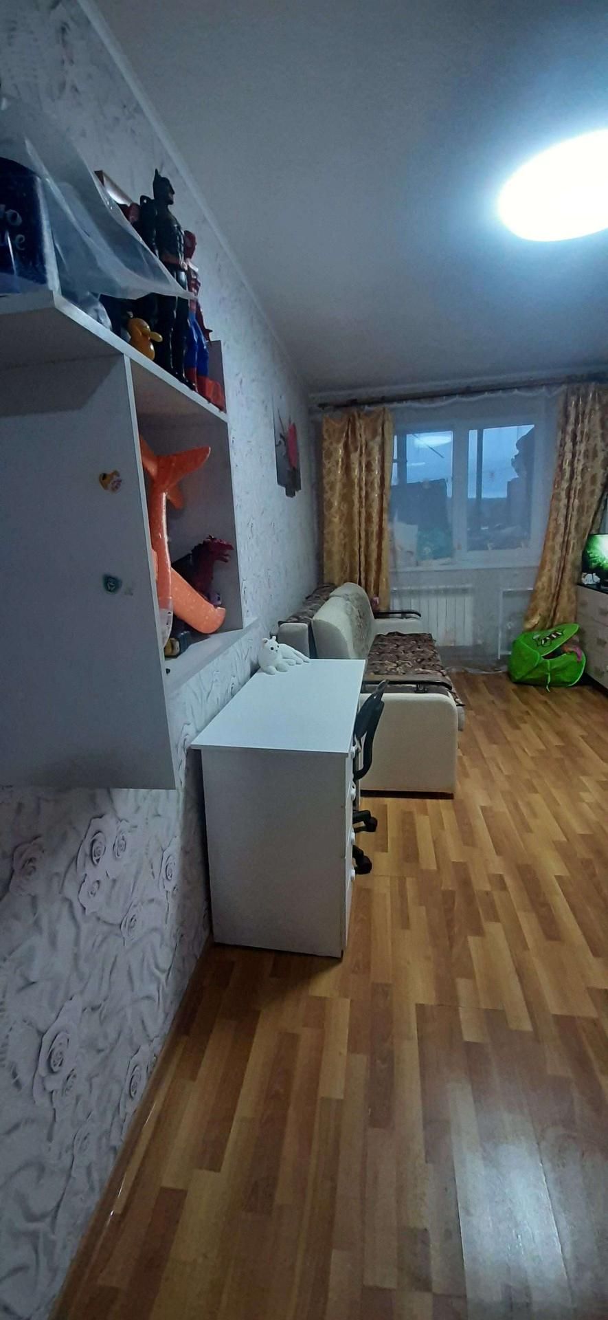 В комнате ламинат,потолок светодиодный светильник.
