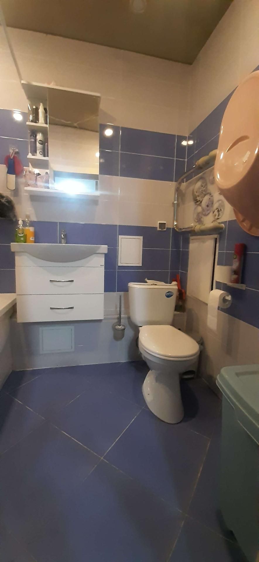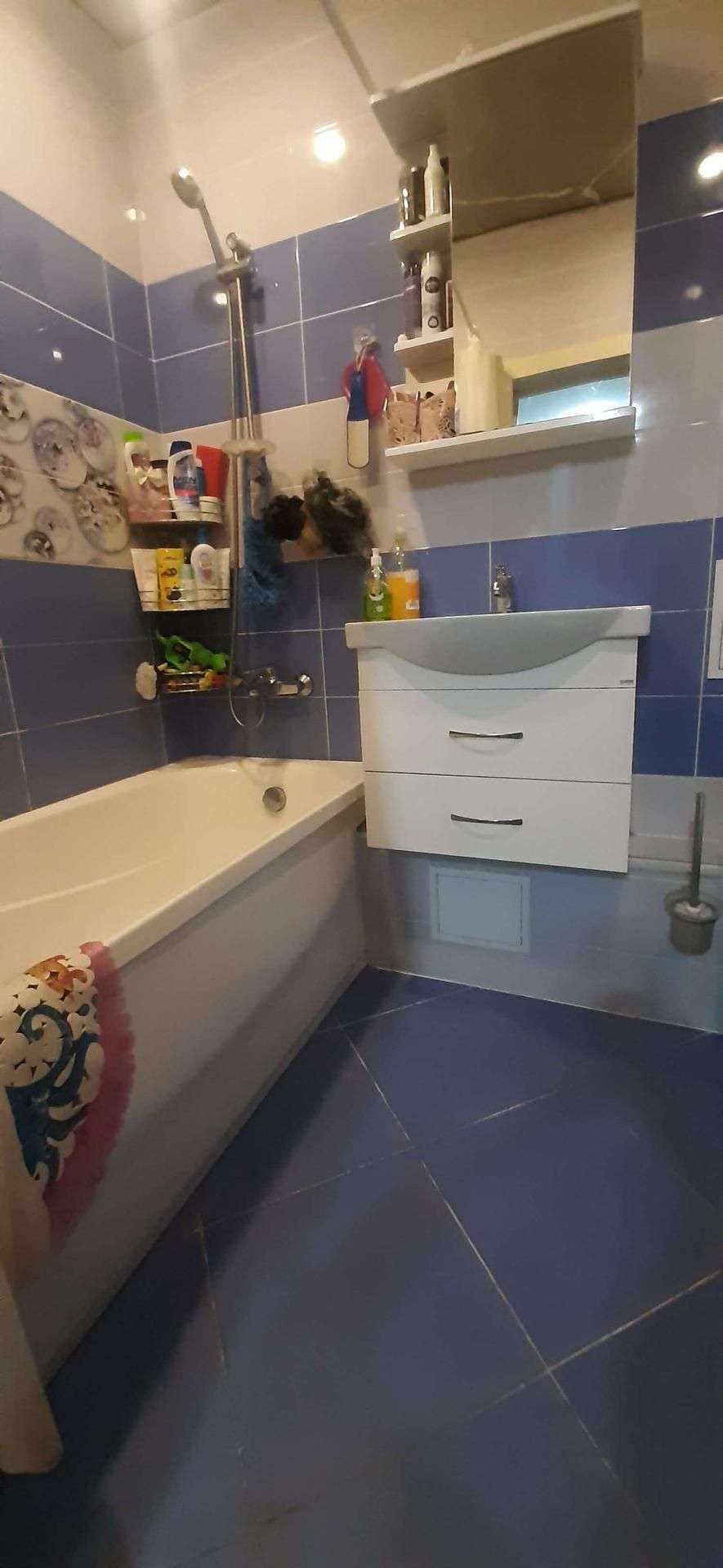 В ванной комнате,акриловая ванна с экраном.Тумба и шкаф остаются.