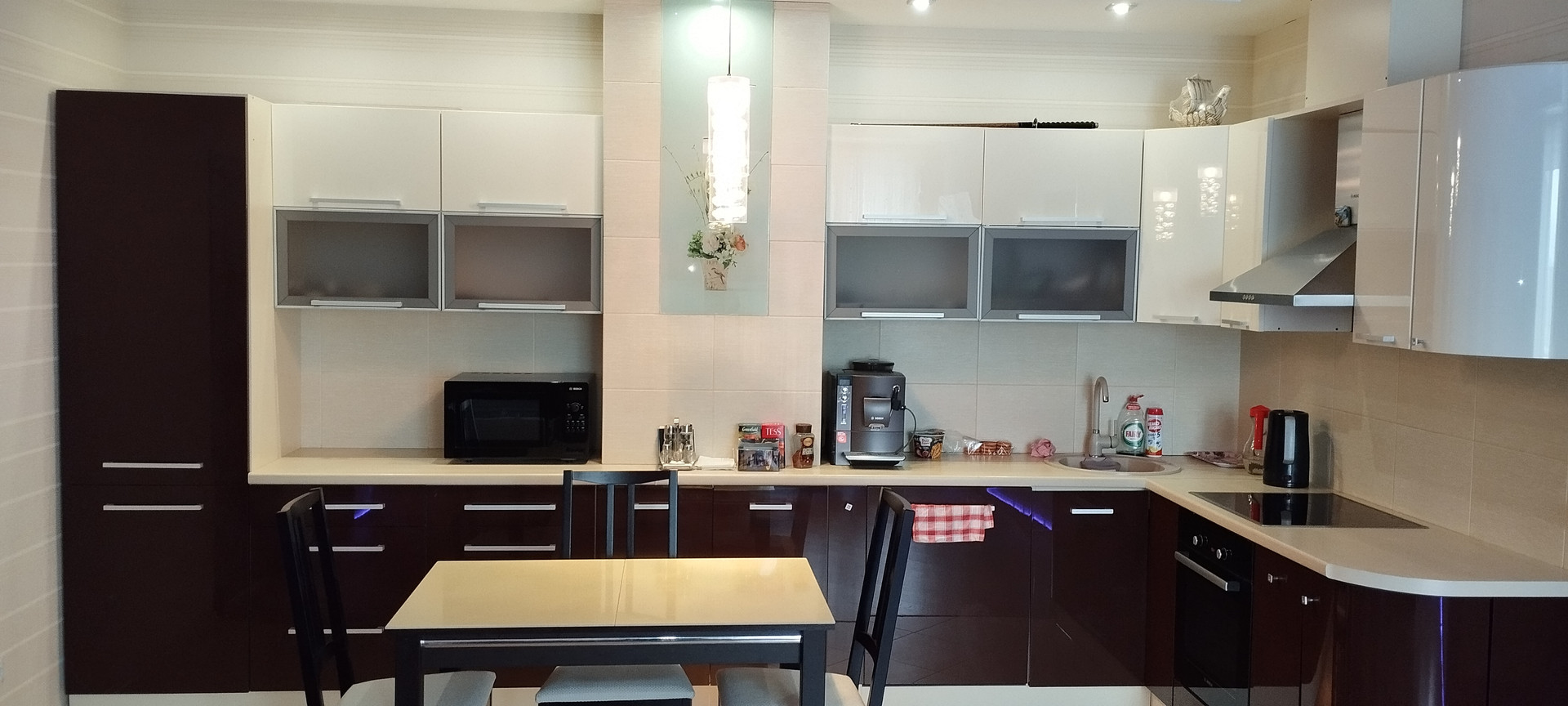- На кухонном пространстве - удобный стол со стульями, для семейных трапез. Качественный встроенный кухонный гарнитур, а так же - холодильник, посудомоечная машина, чайник, кофеварка, элетроплита, вытяжка.