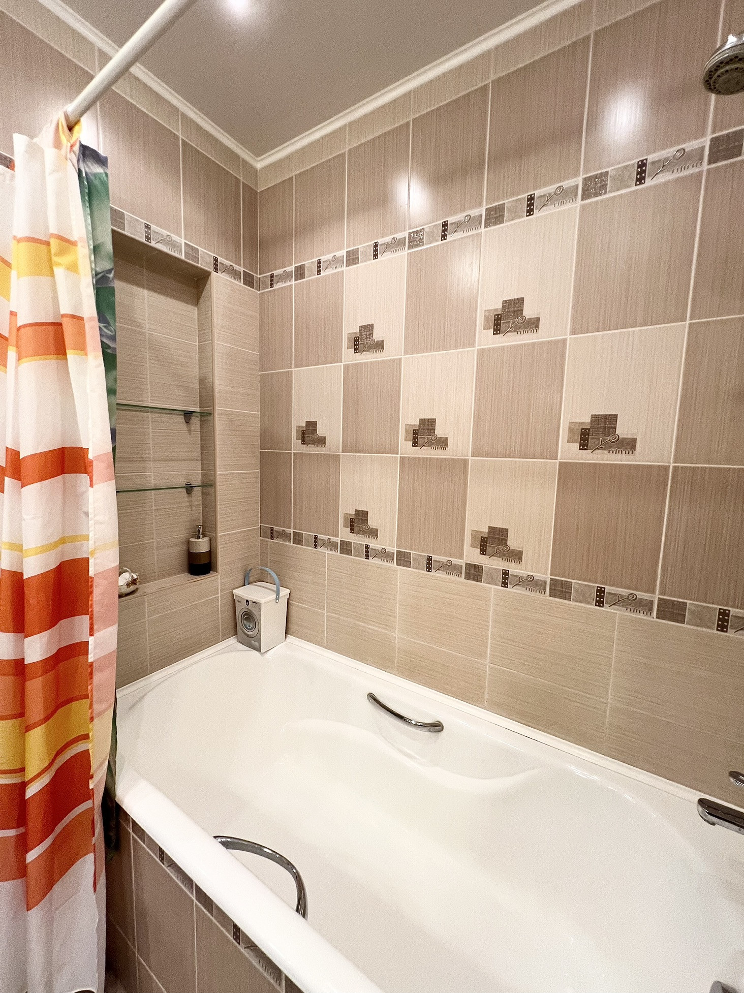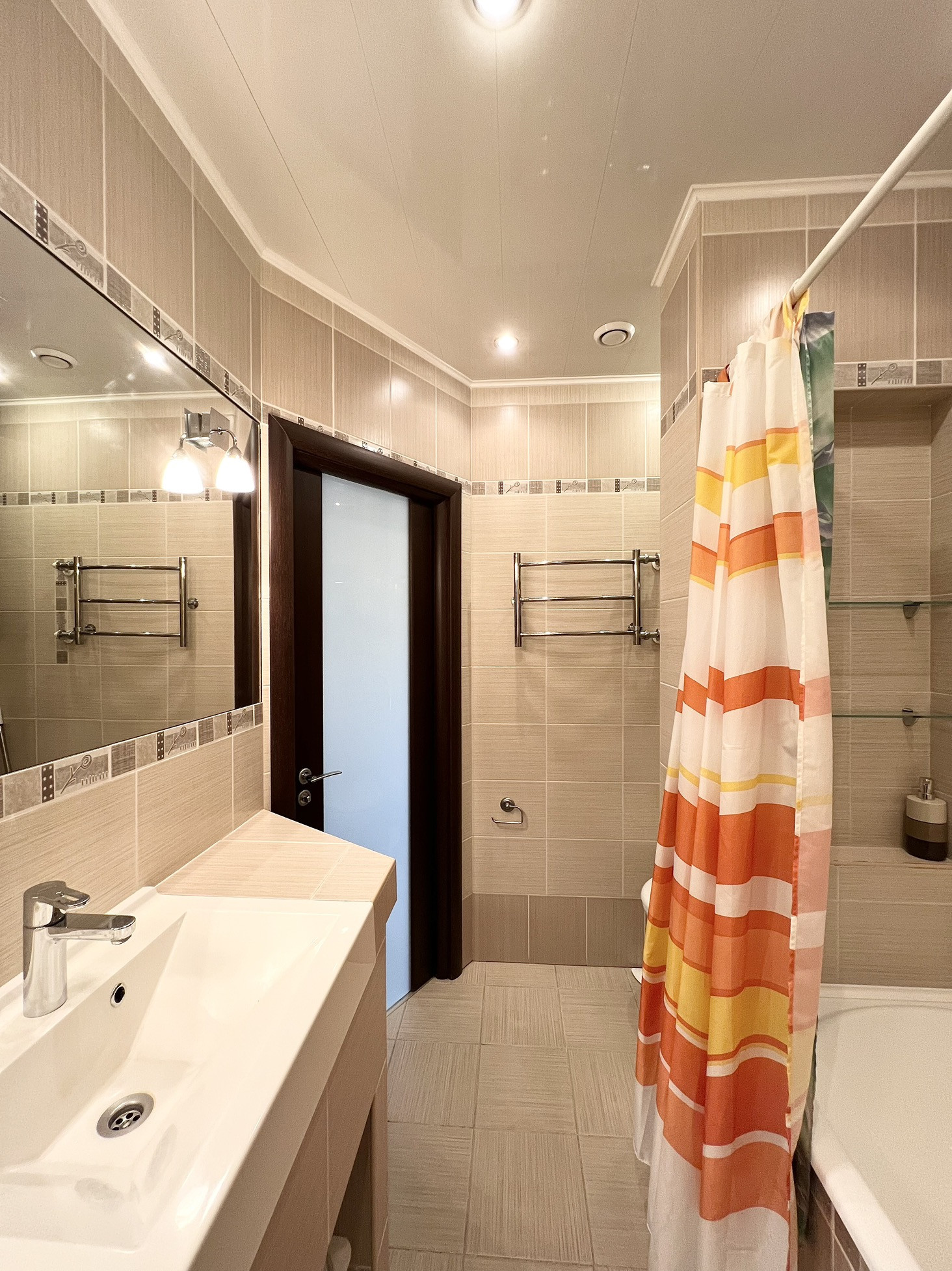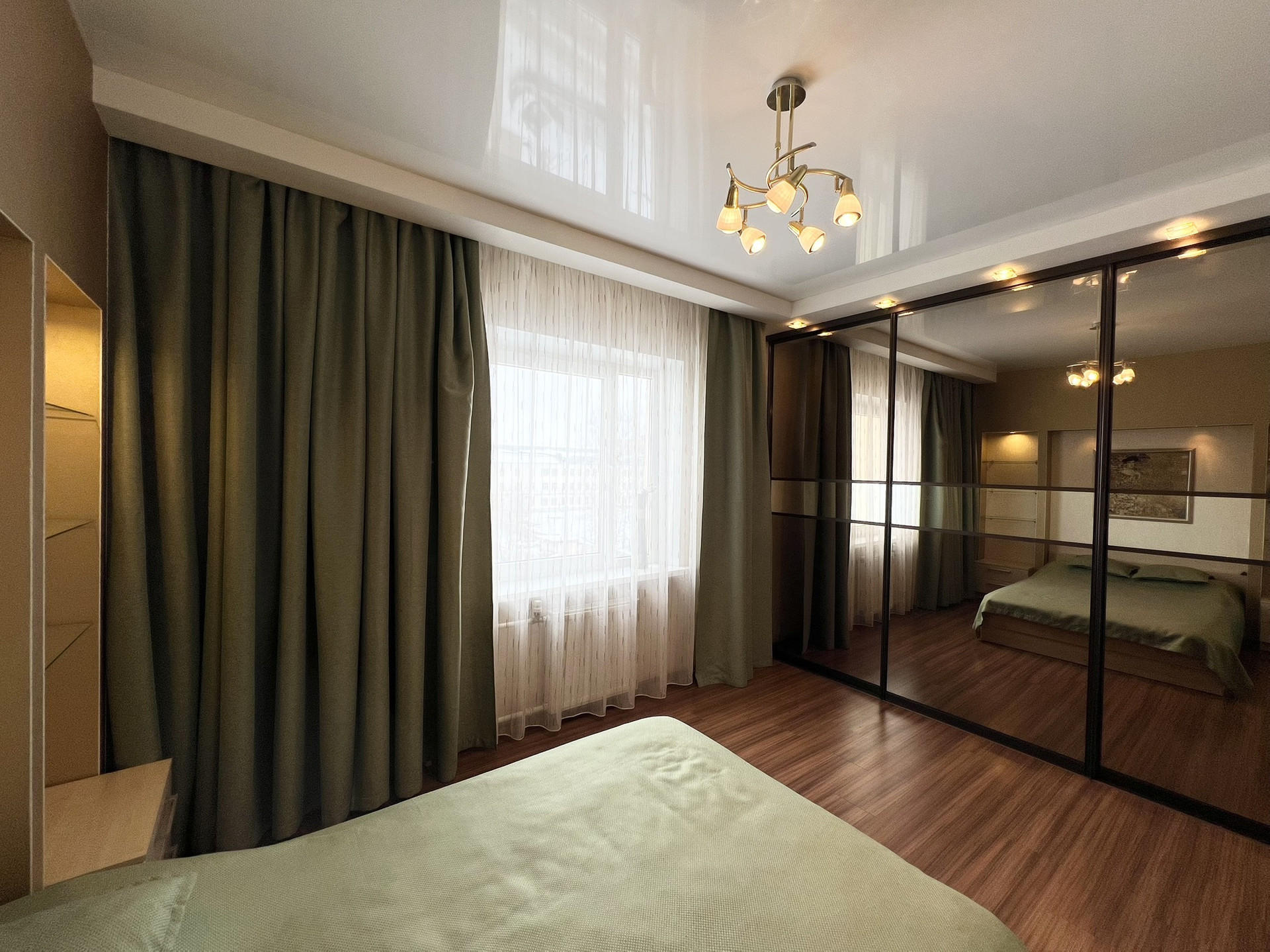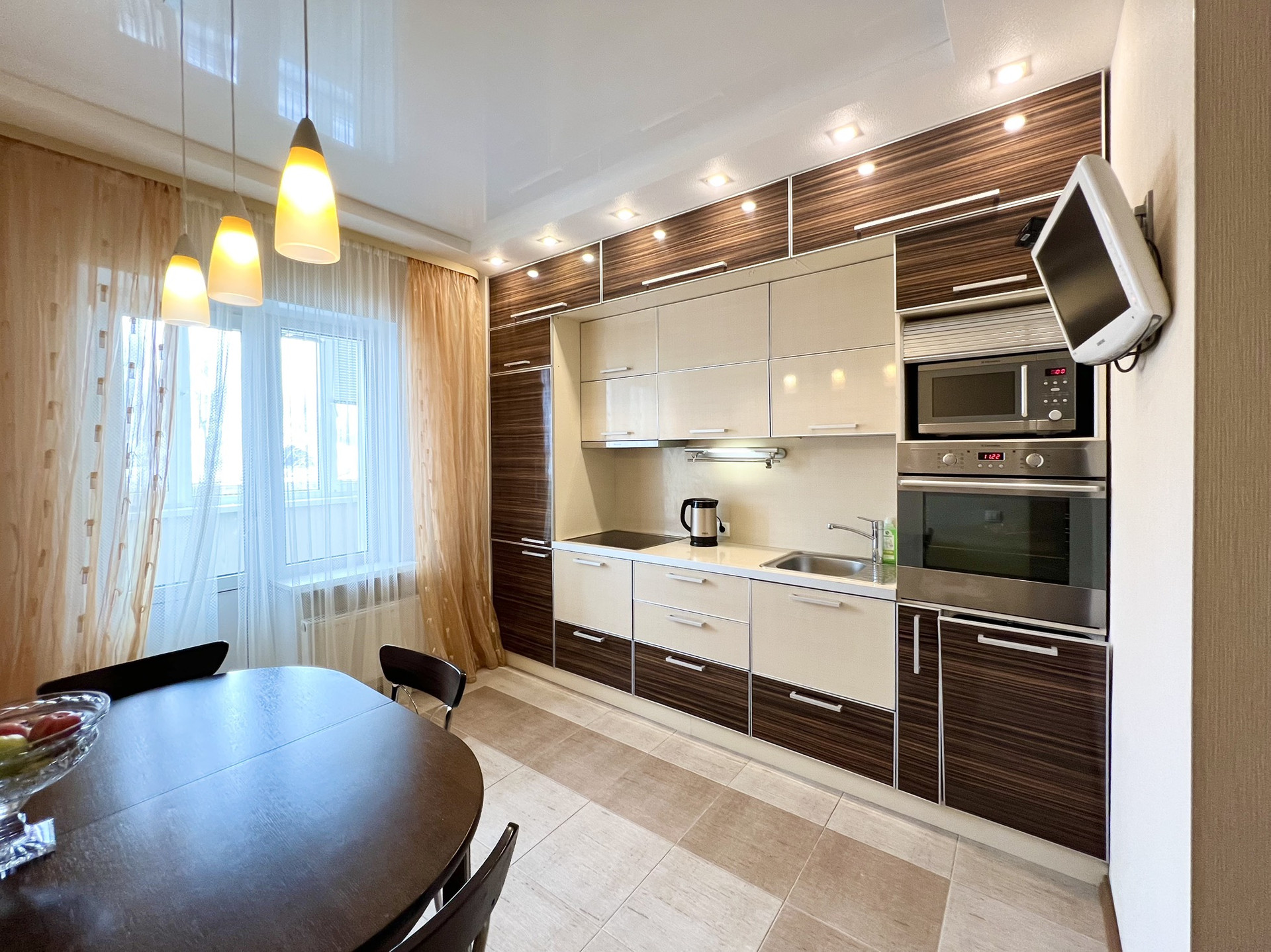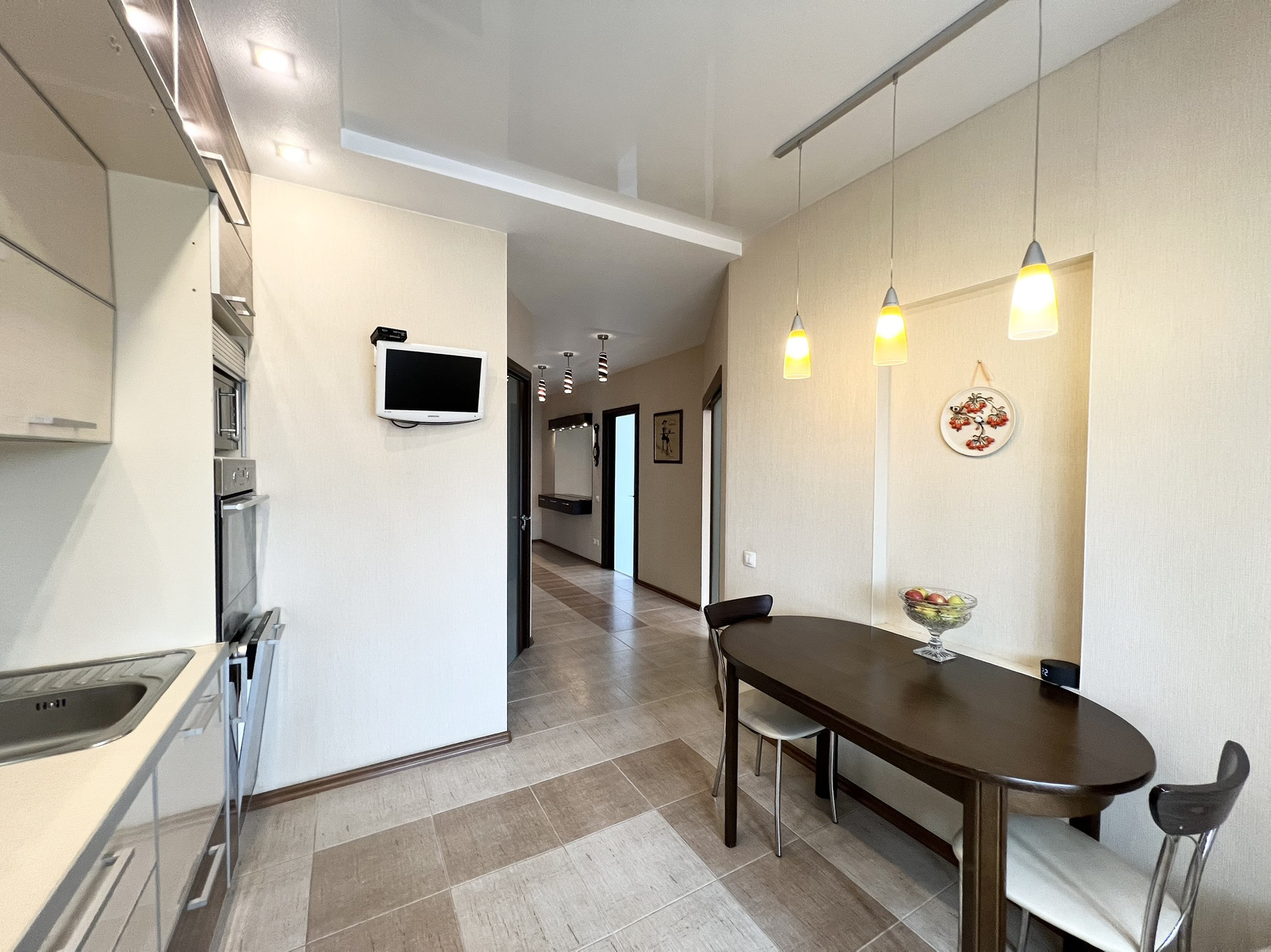 Полы - ламинат 33 класс (гостиная, спальня); керамическая плитка - кухня, ванная, прихожая); потолки - натяжные с установкой встроенных светодиодных светильников и подвесных; стены- виниловые обои; ванная комната – сантехника Grohe, бойлер на 100 л, ванна – чугунная (ширина-80 см), унитаз подвесной с инсталляцией, раковина встроена в столешницу, сделанную из керамической плитки; разводка электрики, (щиток внутри квартиры); утепленный балкон (стеклопакеты (жалюзи), керамическая плитка, освещение; межкомнатные двери и вторая входная дверь Sofia.