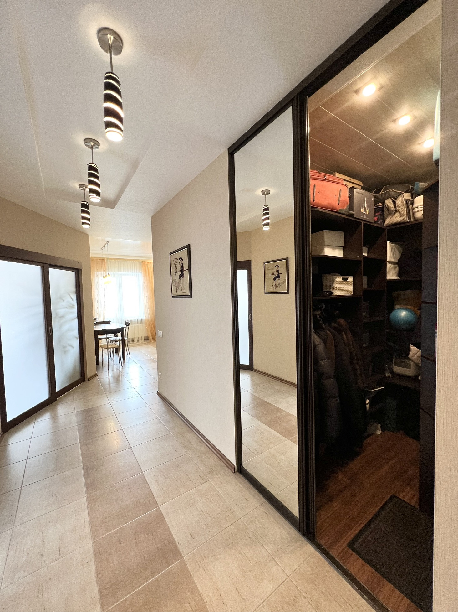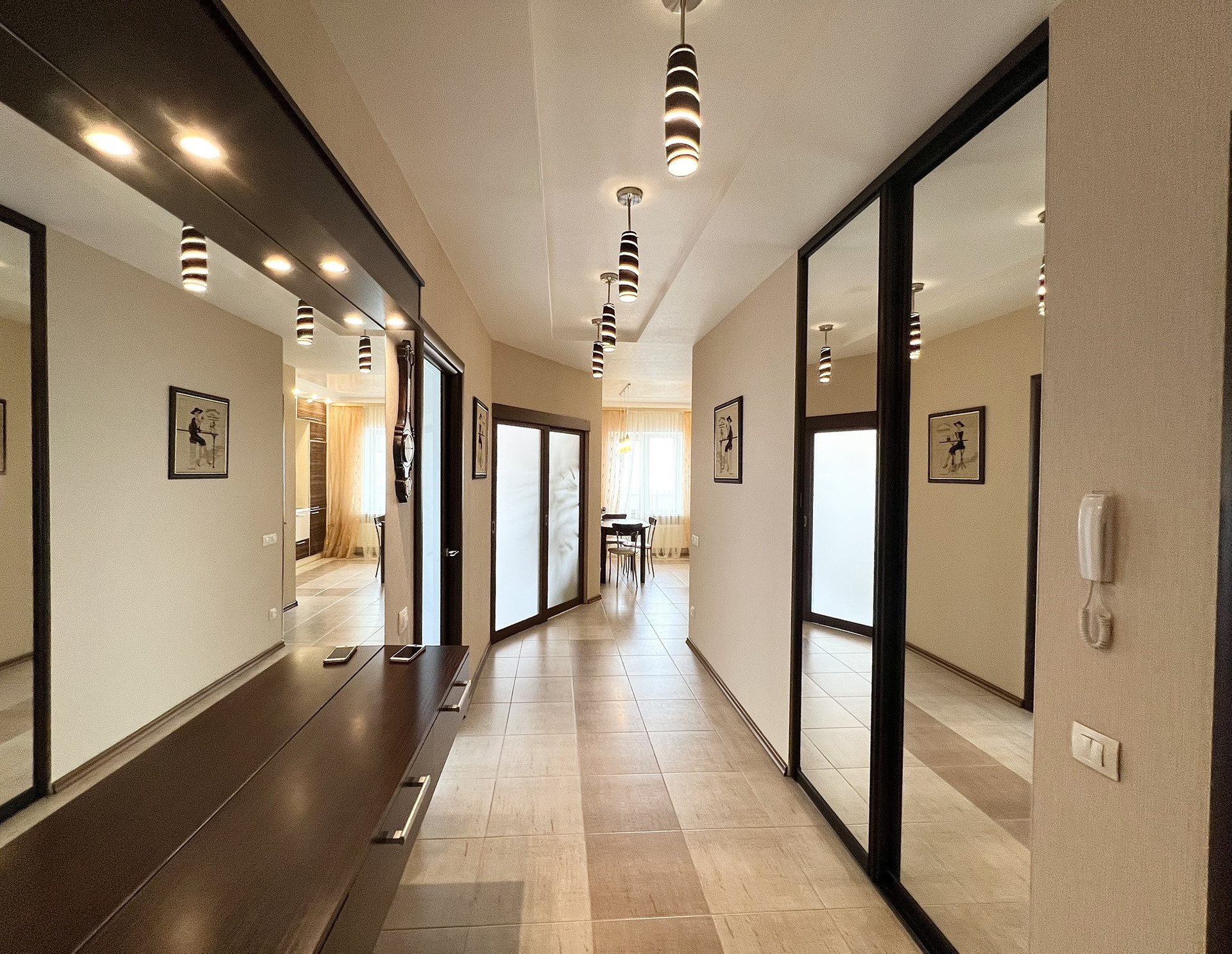 Мебель изготовлена по индивидуальным размерам (с доп.подсветкой). Высокие зеркала в прихожей, спальне!Просторная прихожая с отдельной гардеробной.