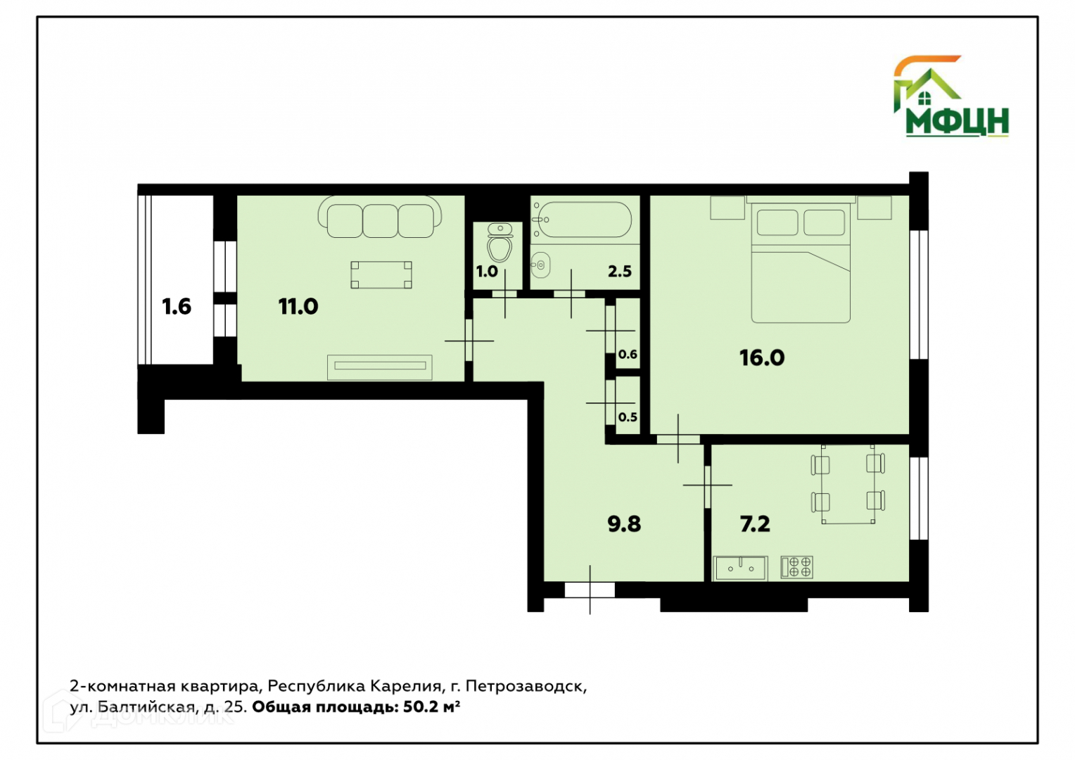 Общая площадь квартиры: 50,2 кв. м. Площадь комнат: 16 и 11 кв. м. Площадь кухни: 7,2 кв. м.