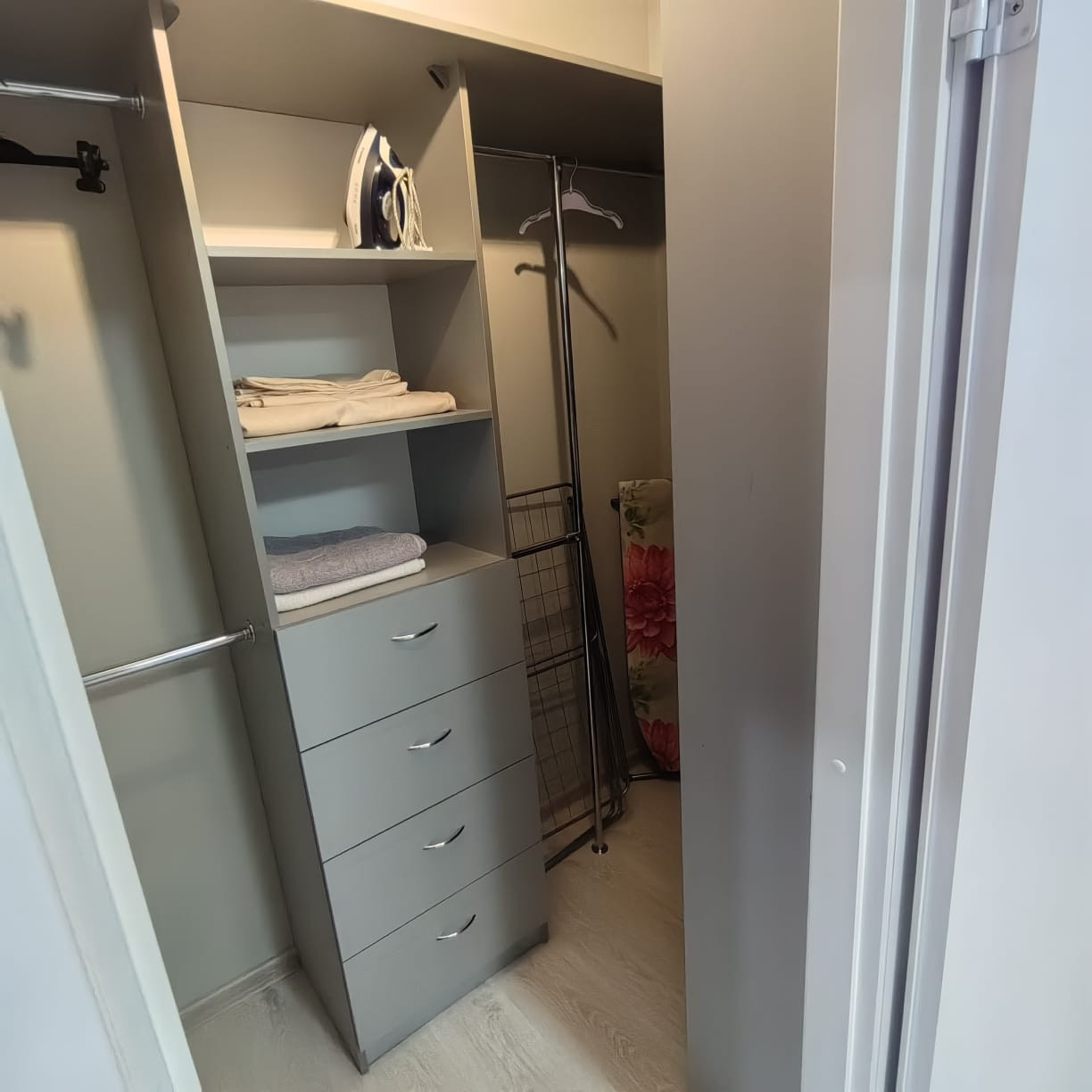 Планировка включает: 1 спальню, 2 вместительных гардеробных, просторную и светлую кухню-гостиную, санузел, аккуратный французский балкончик.