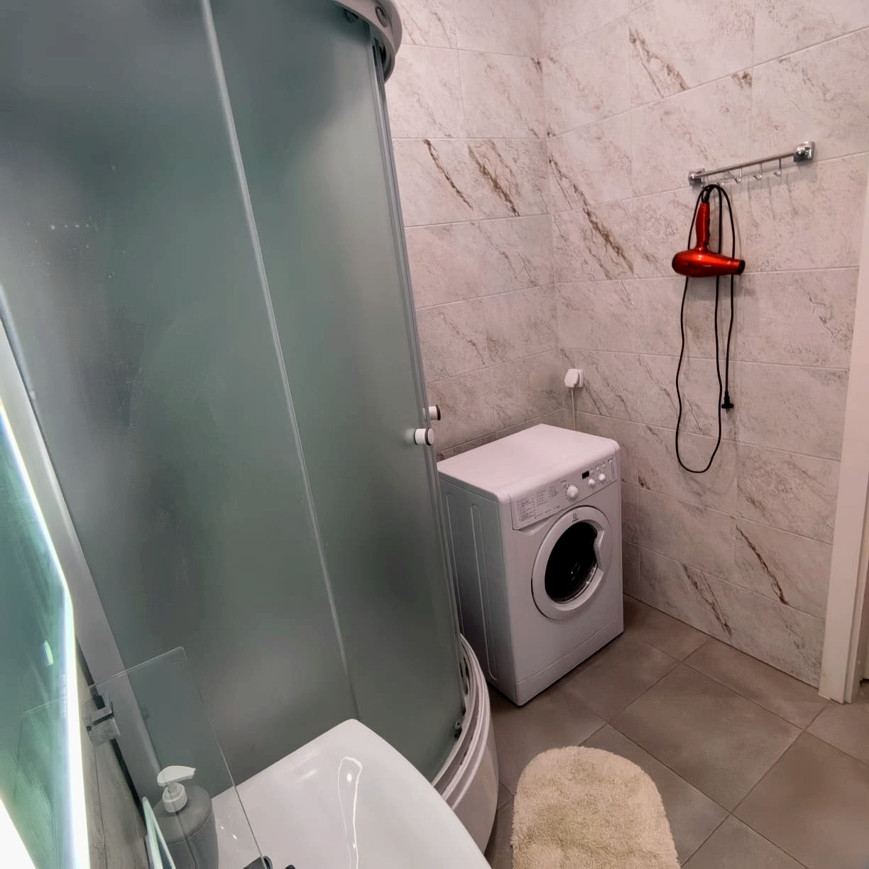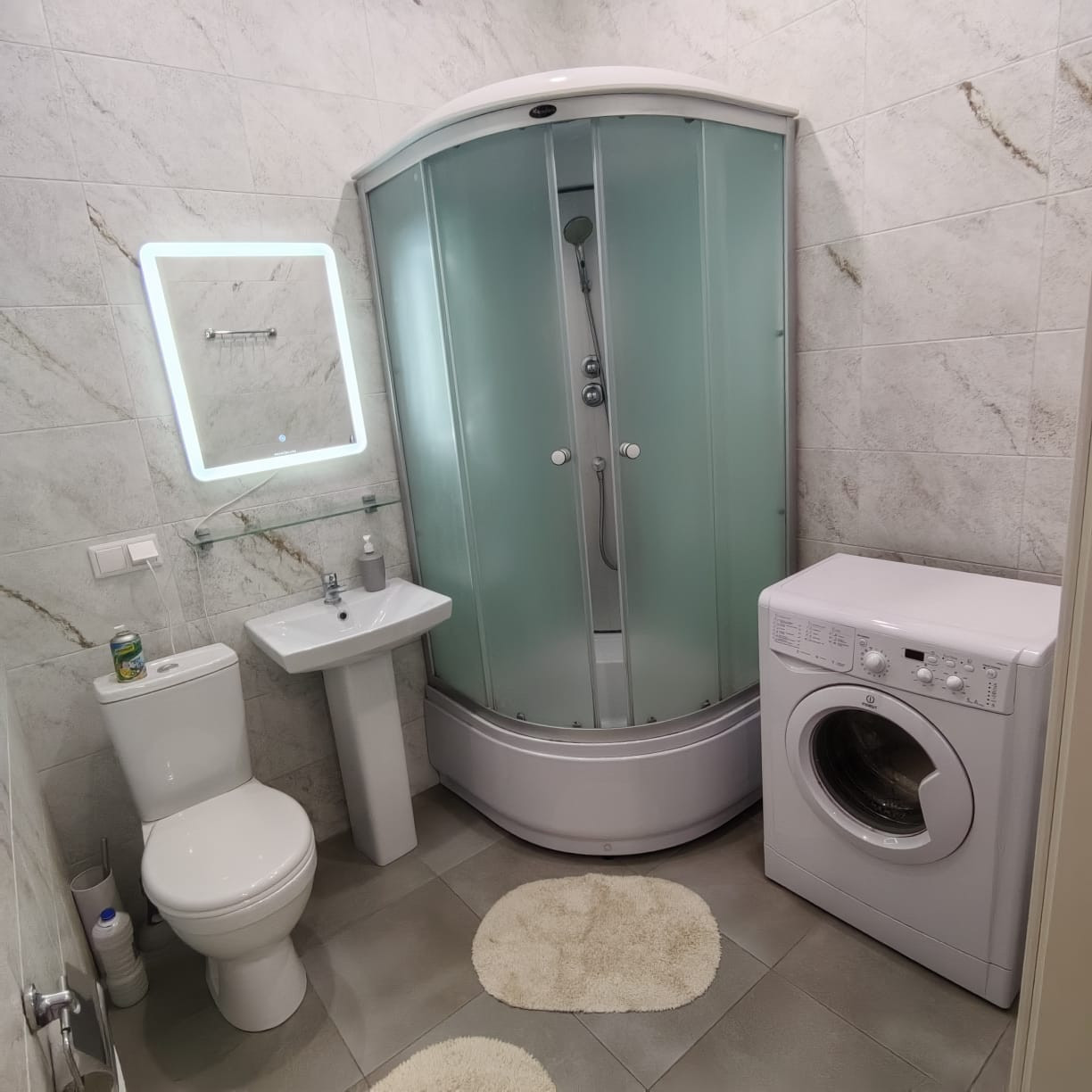 -> В квартире выполнен качественный ремонт. Санузел - совмещенный, отделка - плитка, счетчики вынесены за пределы квартиры, душевая кабина, тёплый пол.
