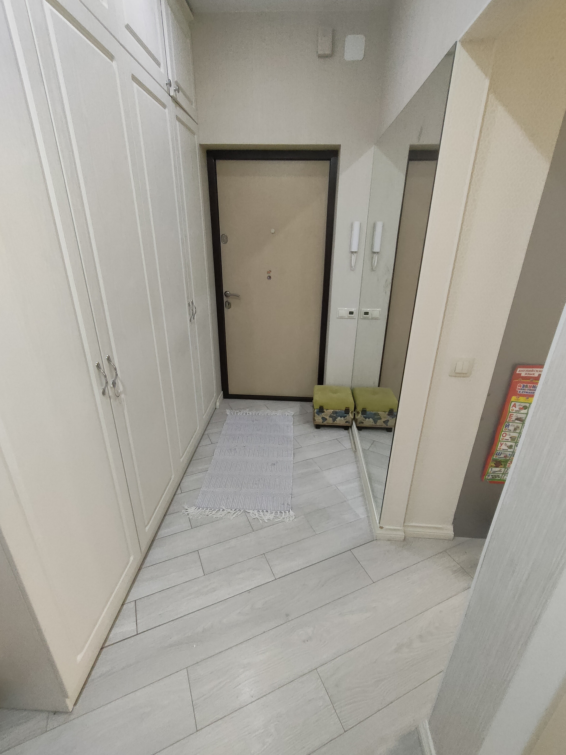 В квартире остается встроенная кухня с бытовой техникой (духовка, варочная панель, посудомойка) Шкаф в прихожей.