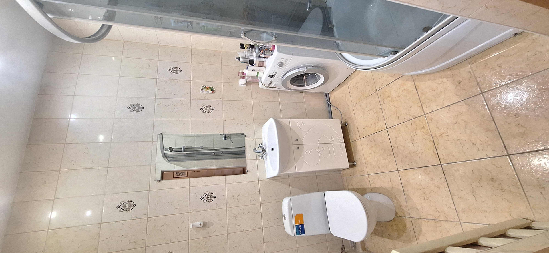 Санузел совмещён.Потолок натяжной,стены и пол плитка. душевая кабина.