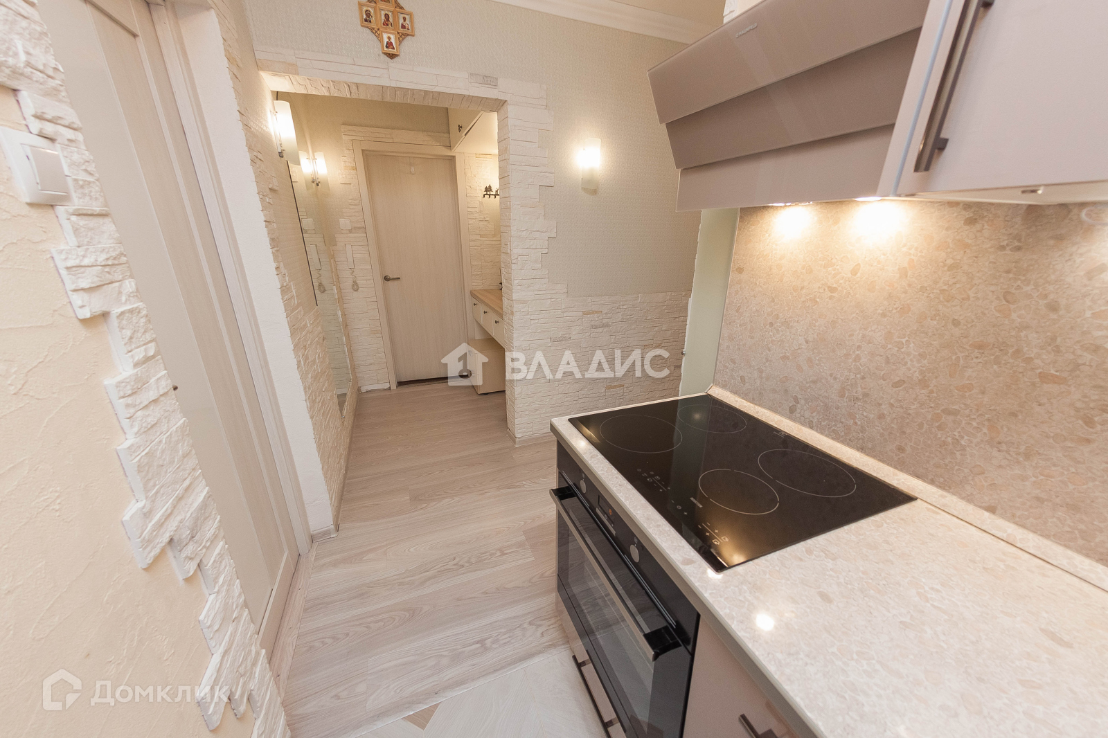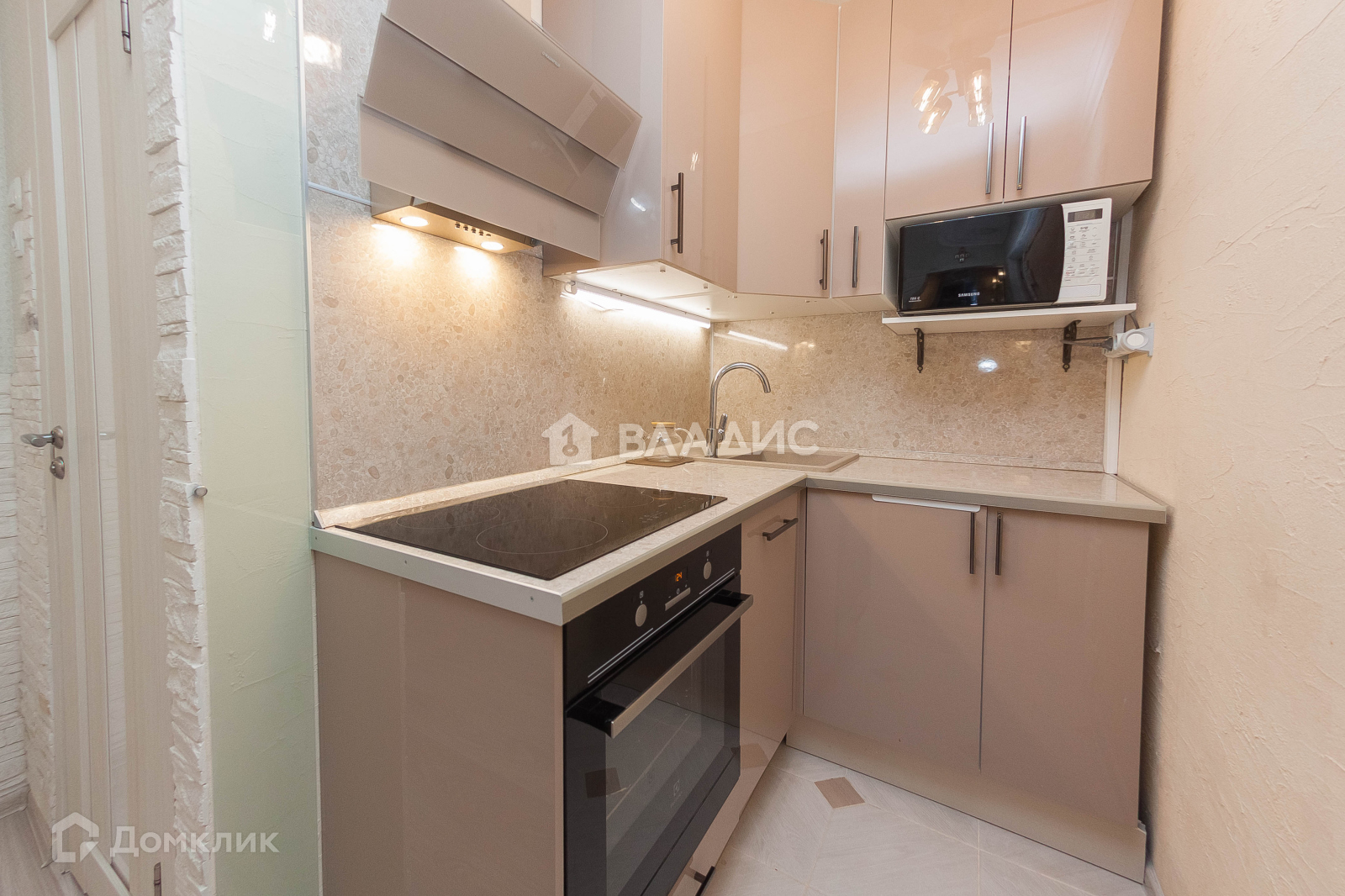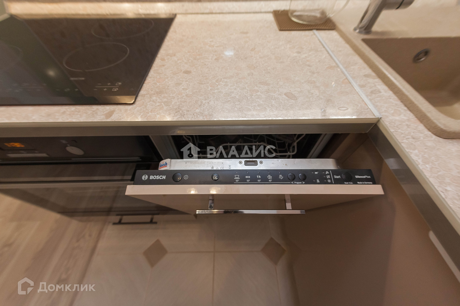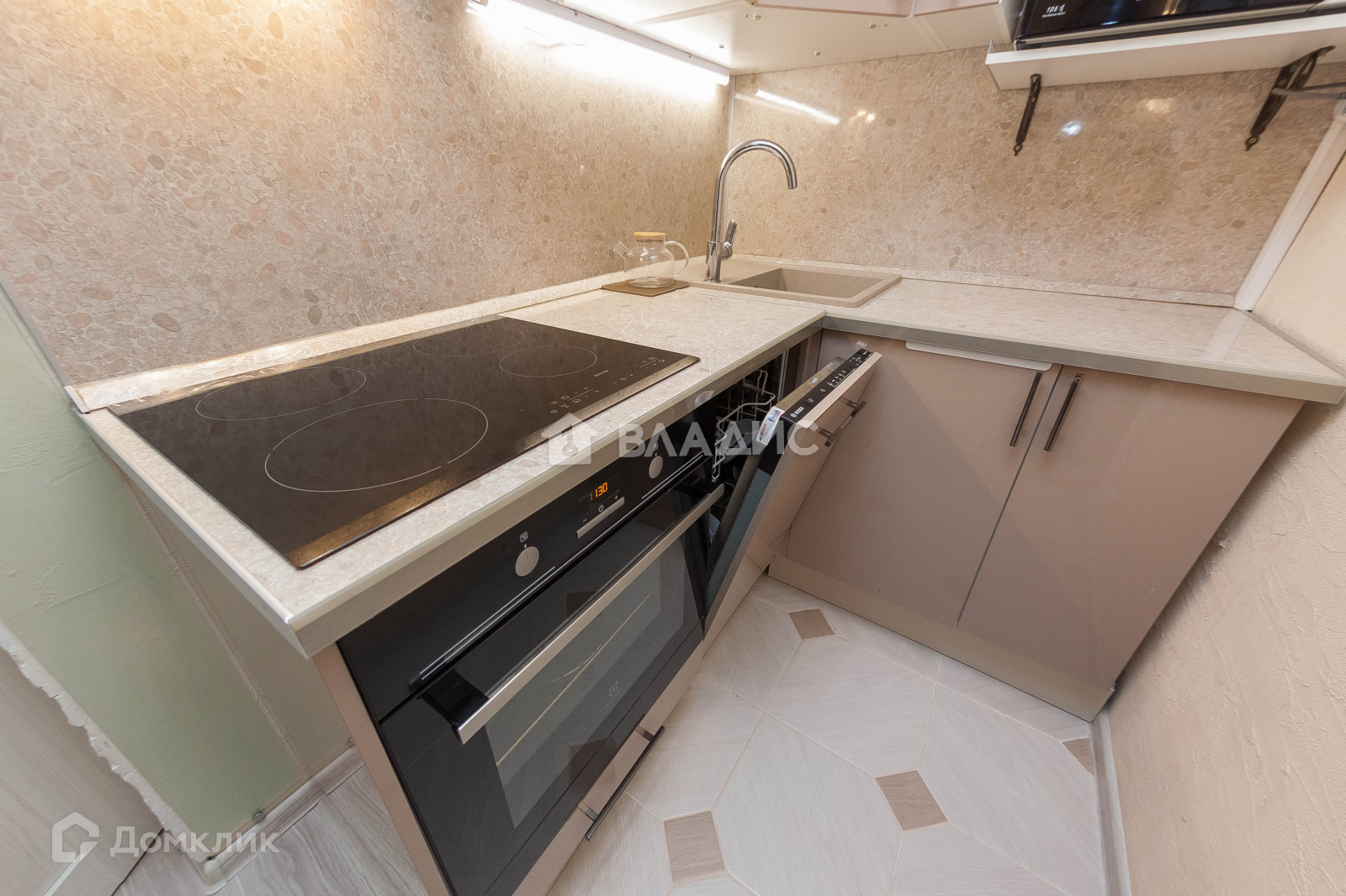 - Кухонный гарнитур с доводчиками и встроенной техникой: духовой шкаф, варочная поверхность, вытяжка,  посудомоечная машина.