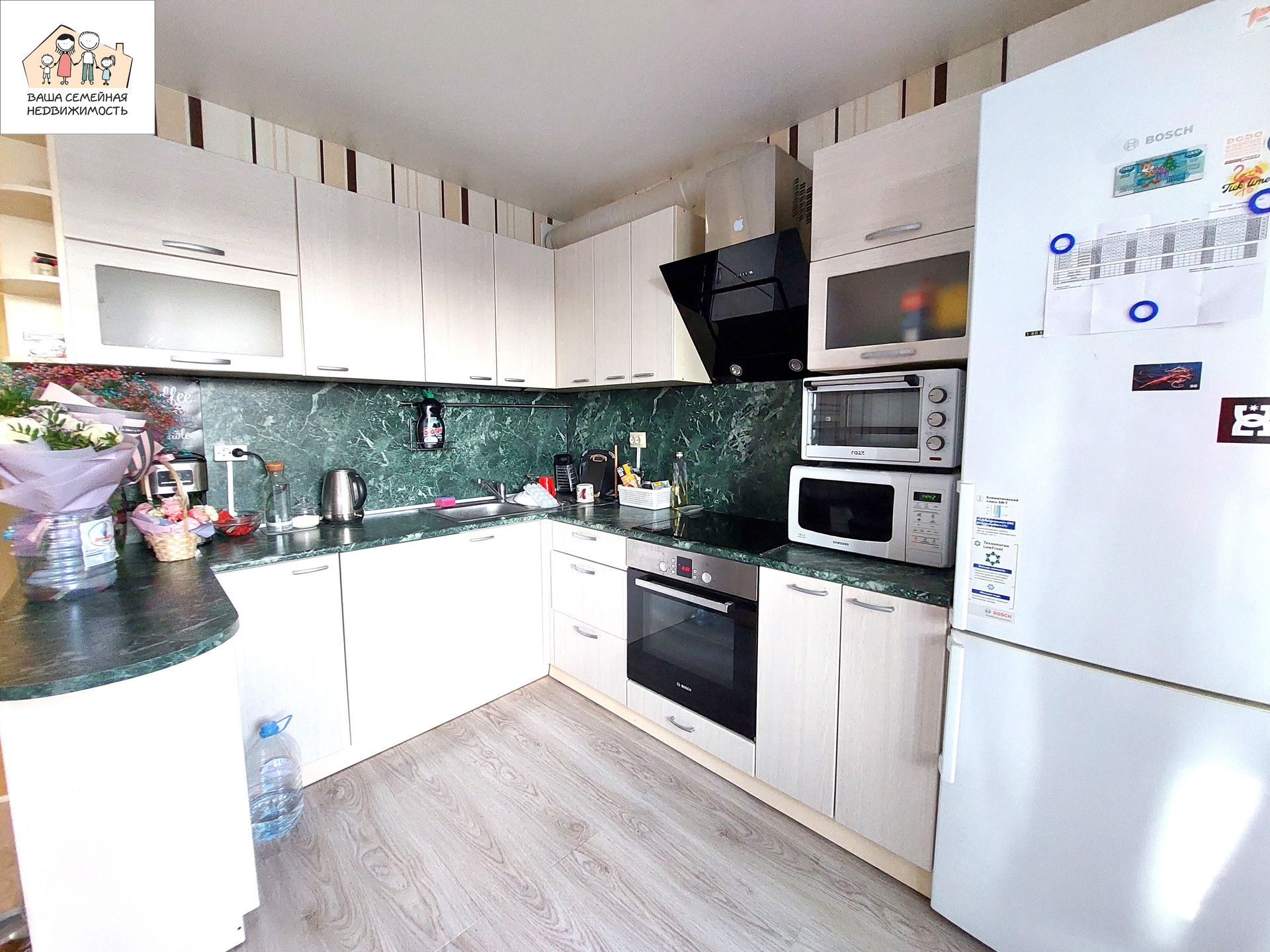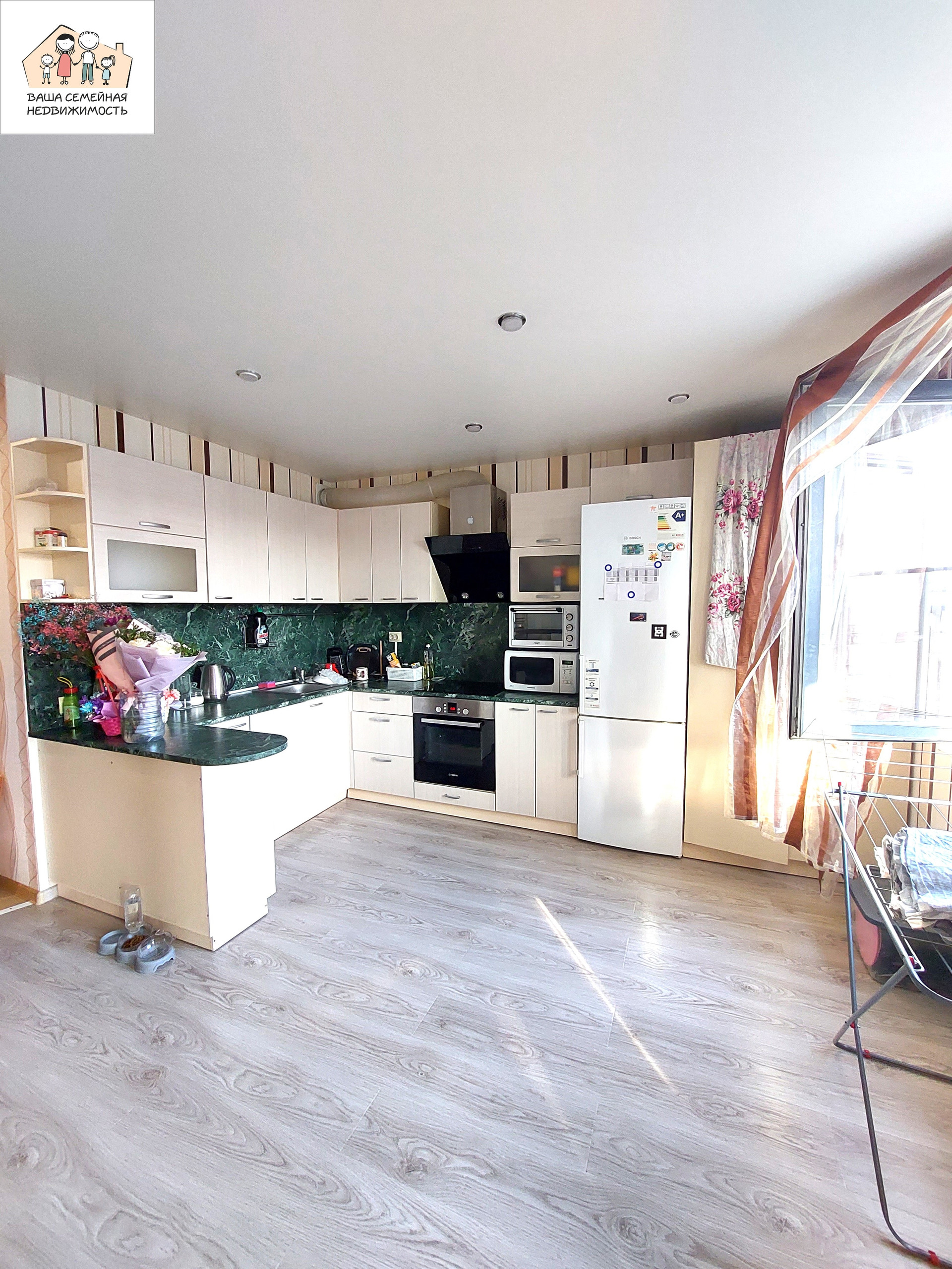 Вся мебель и техника остаются новым собственникам! Кухонный гарнитур с электрической поверхностью, духовым шкафом, вытяжкой, посудомоечной машиной, холодильником, микроволновкой. 2-спальный диван, стиральная машина. Вместительный встроенный шкаф-купе в прихожей.