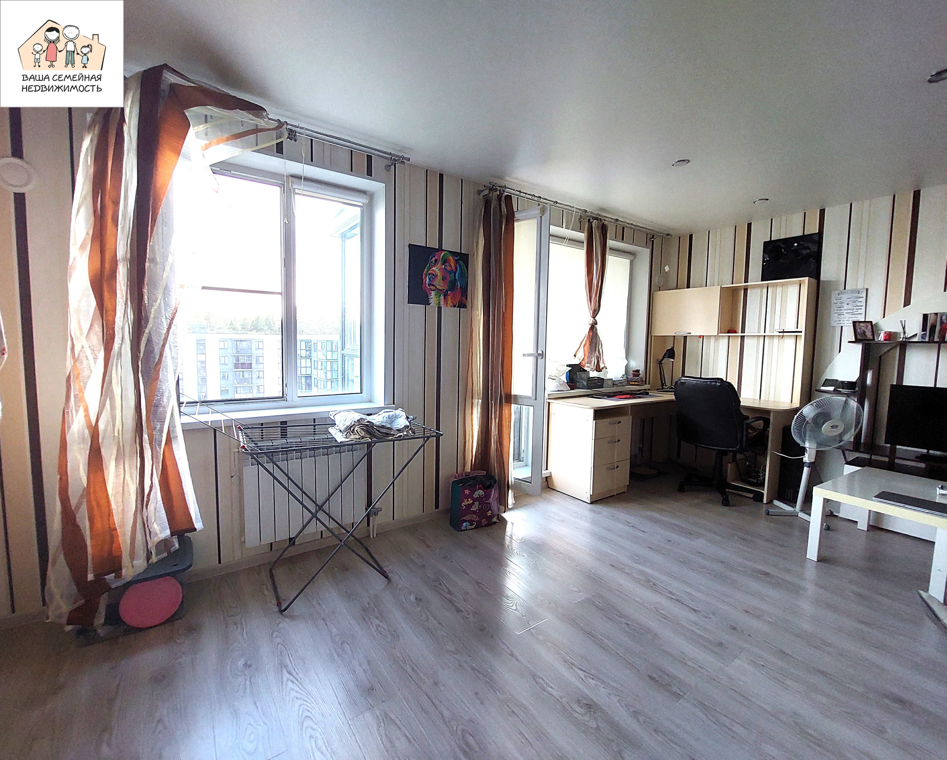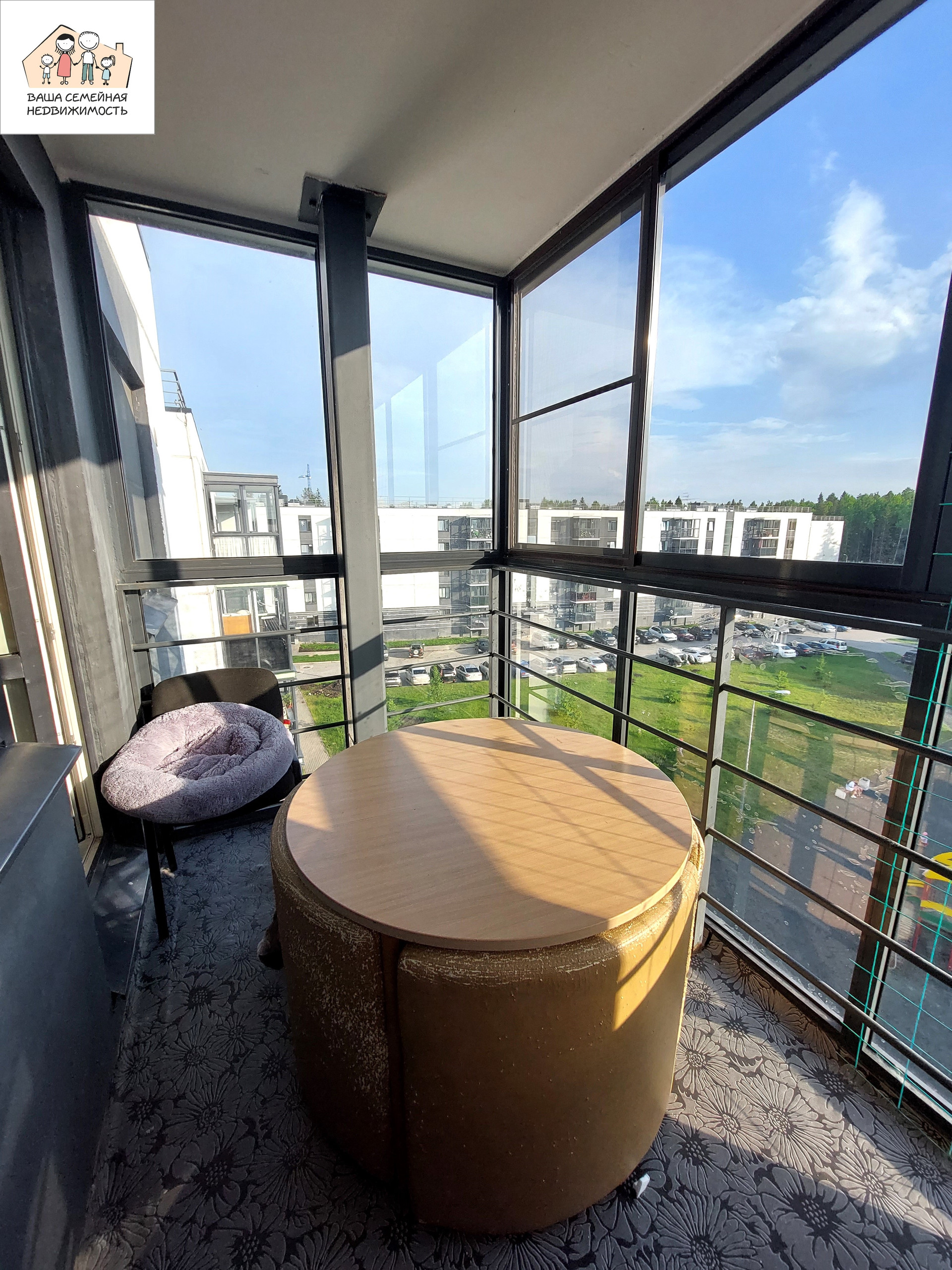 Шикарная просторная лоджия площадью 5,53 кв.м. с панорамным остеклением с видом на двор (детская площадка) и лес!