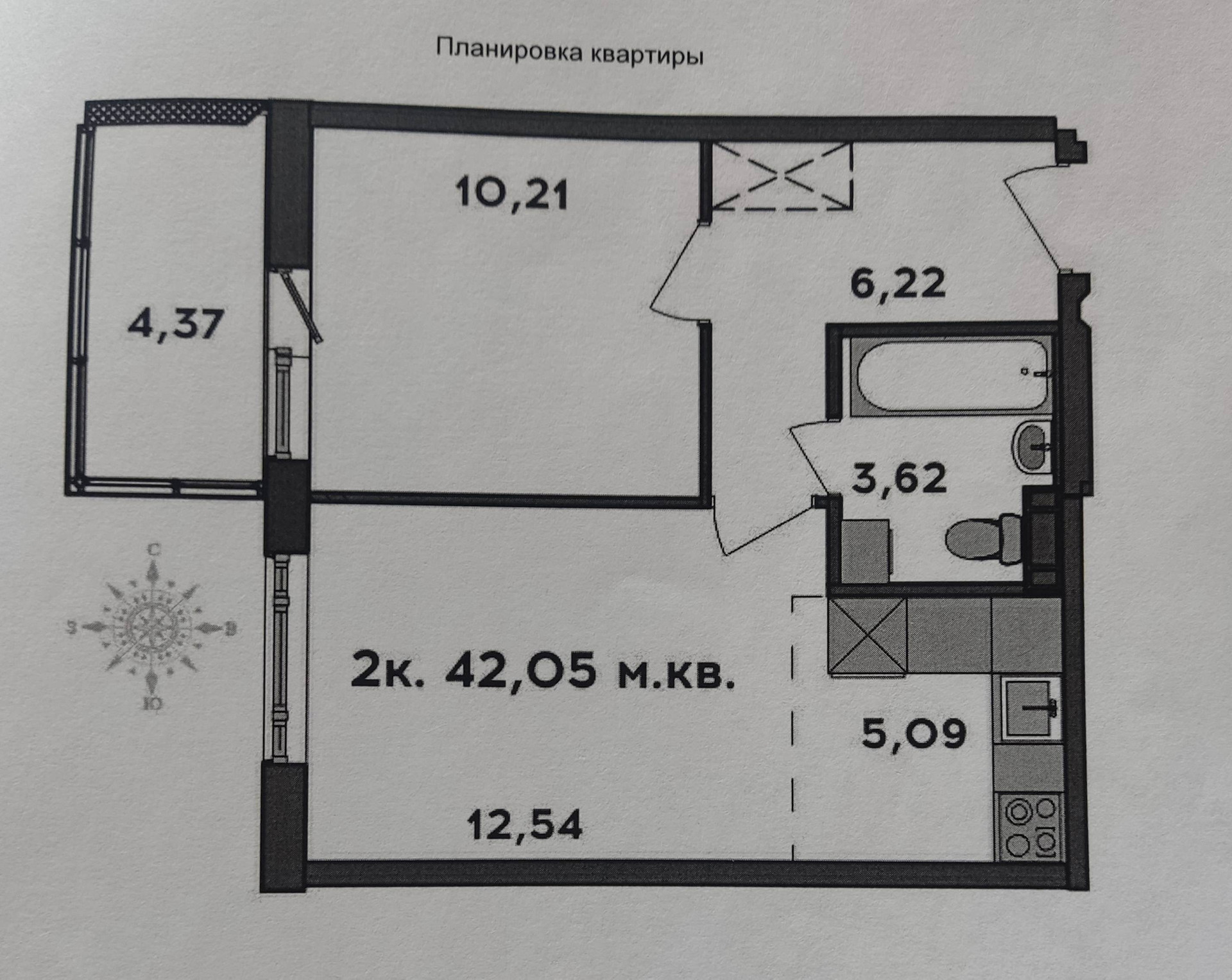 Общая площадь 42.05м2,