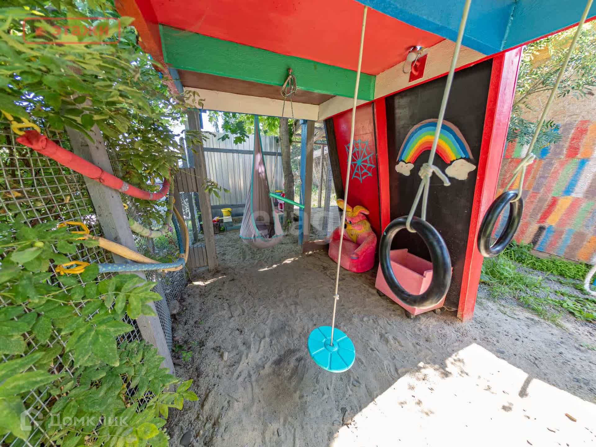 Обустроена летняя кухня. Устроена детская площадка. Есть вольер для собаки.