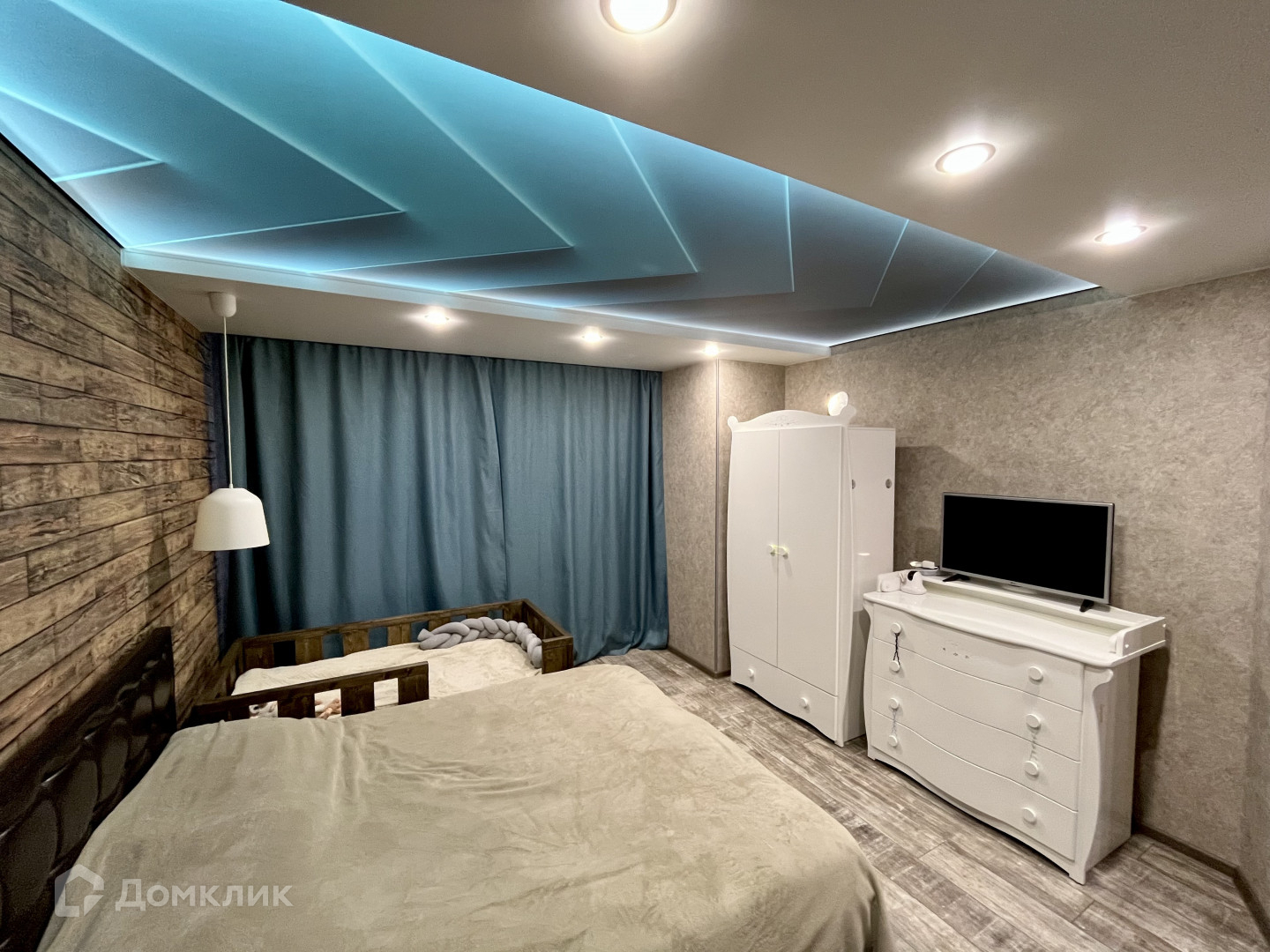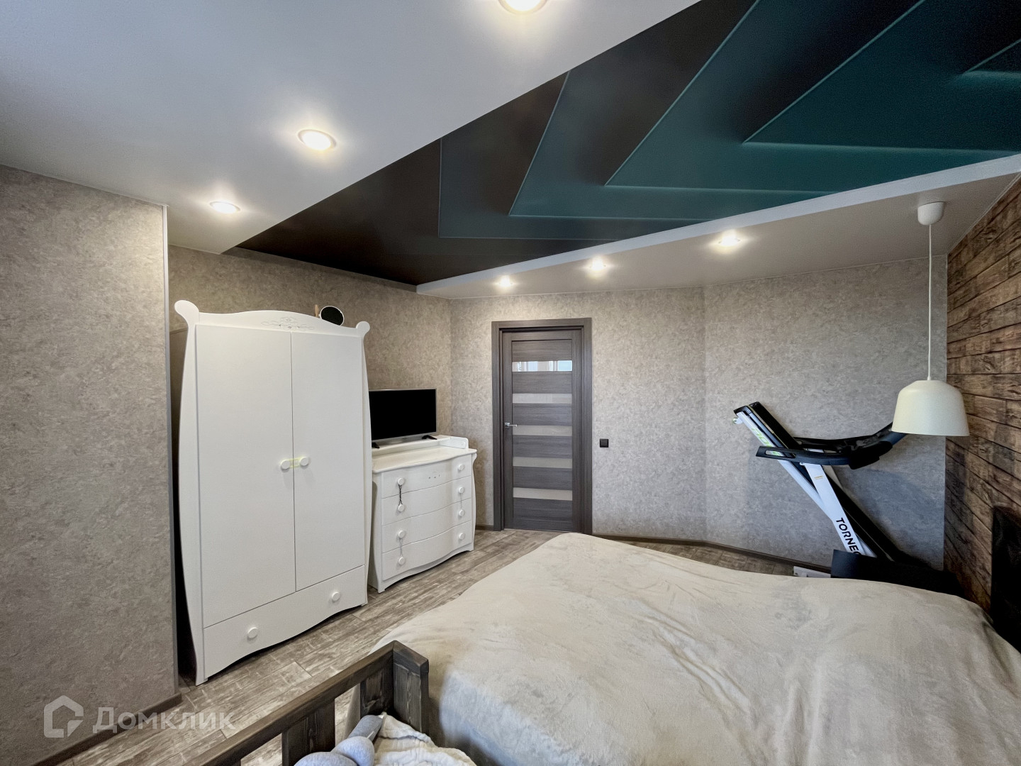 В спальной комнате установлен двухуровневый потолок в дизайнерском стиле.