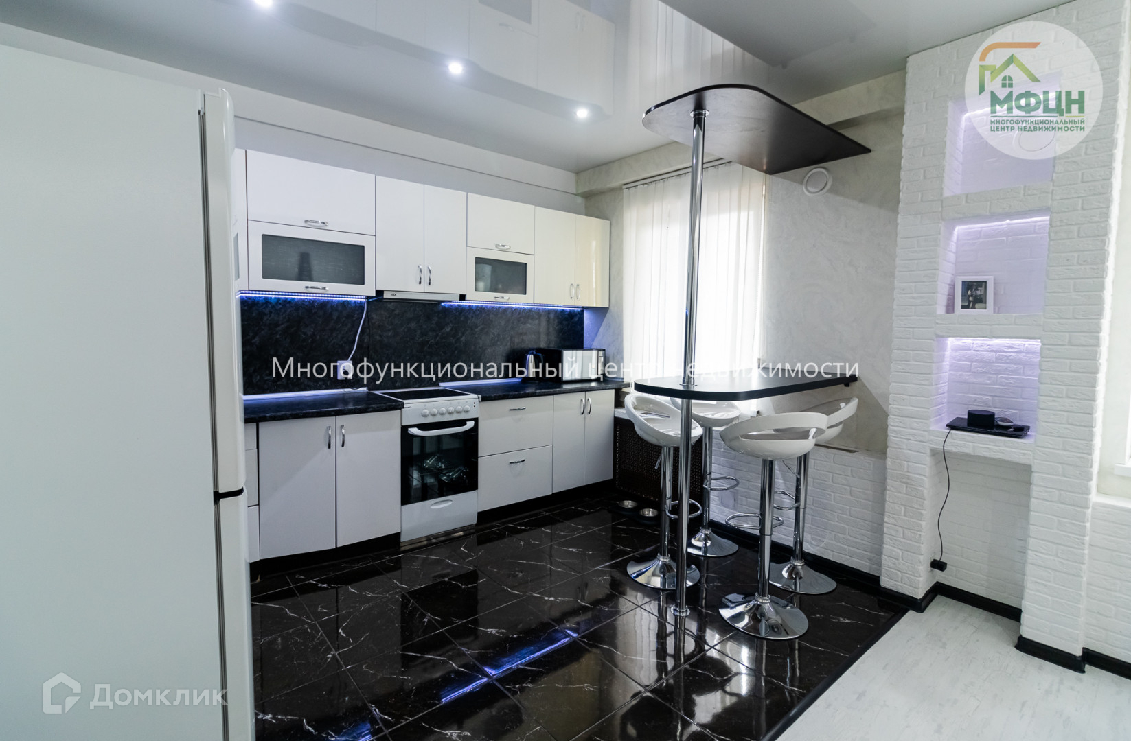 Остается встроенная кухня по индивидуальному заказу, встроенный шкаф и барный стол со стульями;
