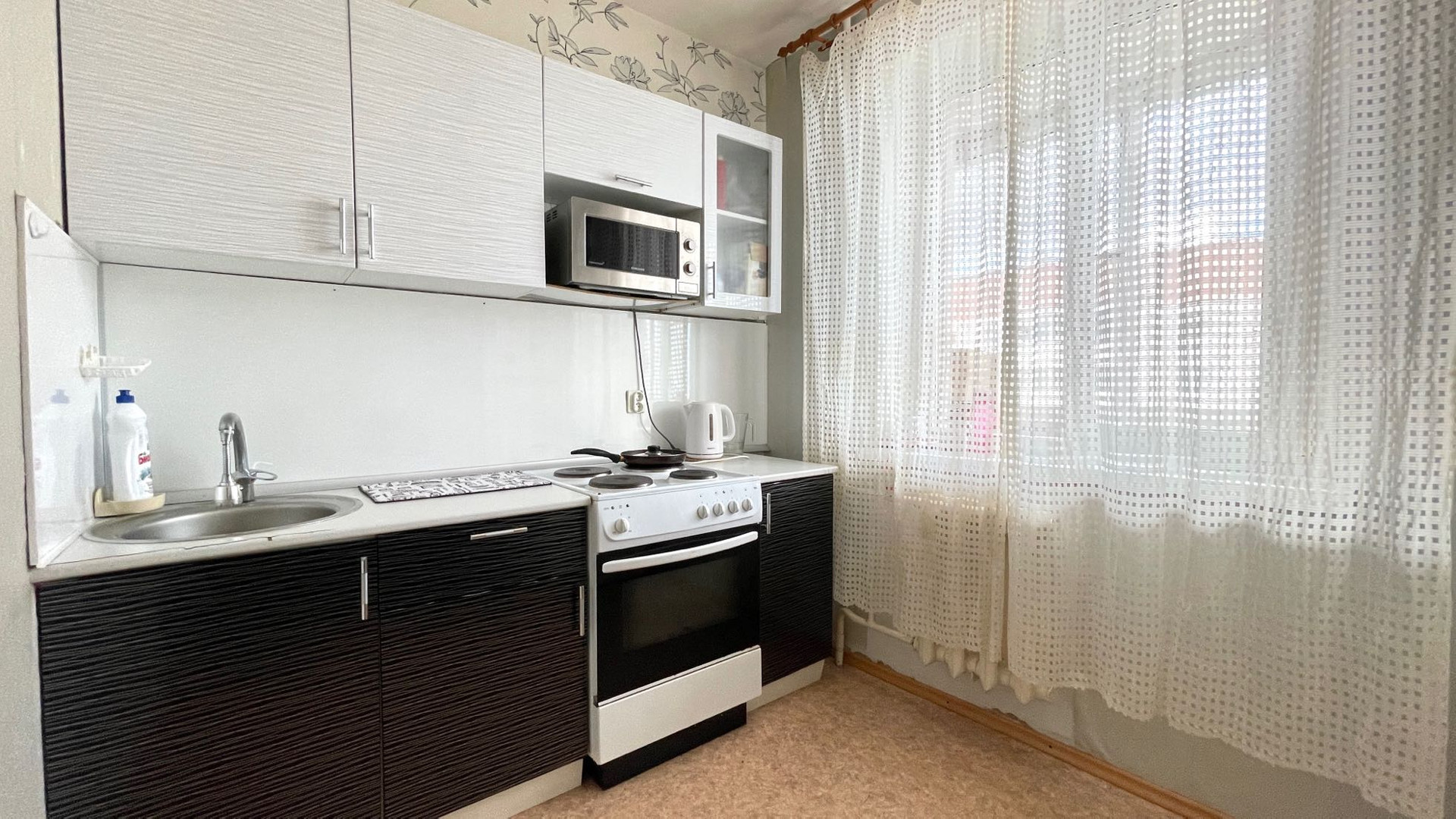 При продаже остается кухня, плита, шкафы.