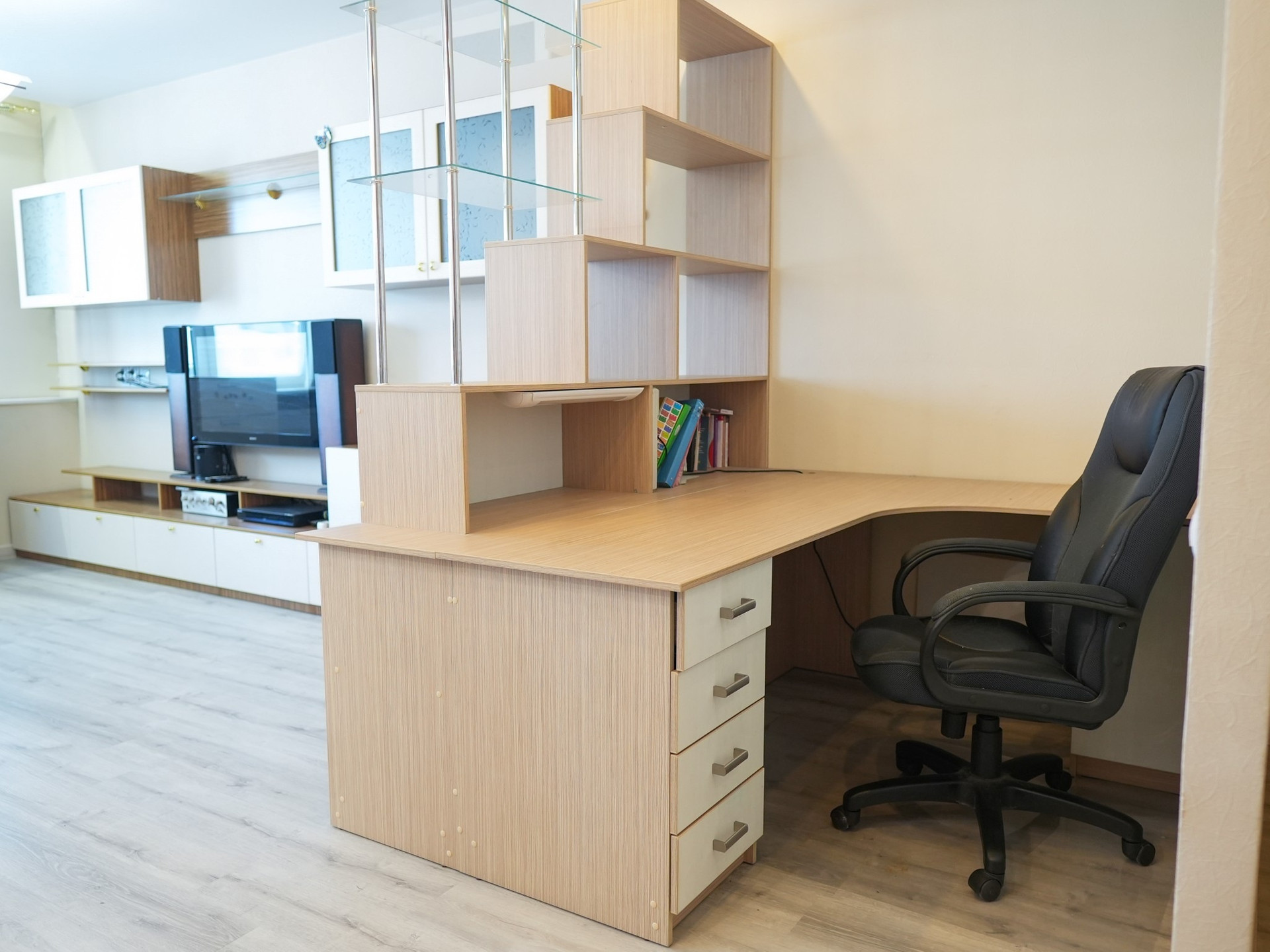 На первом этаже есть выделенная зона с большим рабочим местом. Имеется полностью утеплённая лоджая с встроенной мебелью, освещением и розетками, использовалась круглогодично. На втором этаже смонтирована гардеробная, мастерская и спортивная шведская стенка. Дополнительно имеется отгороженный от подъезда коридор на две квартиры для хранения вещей.