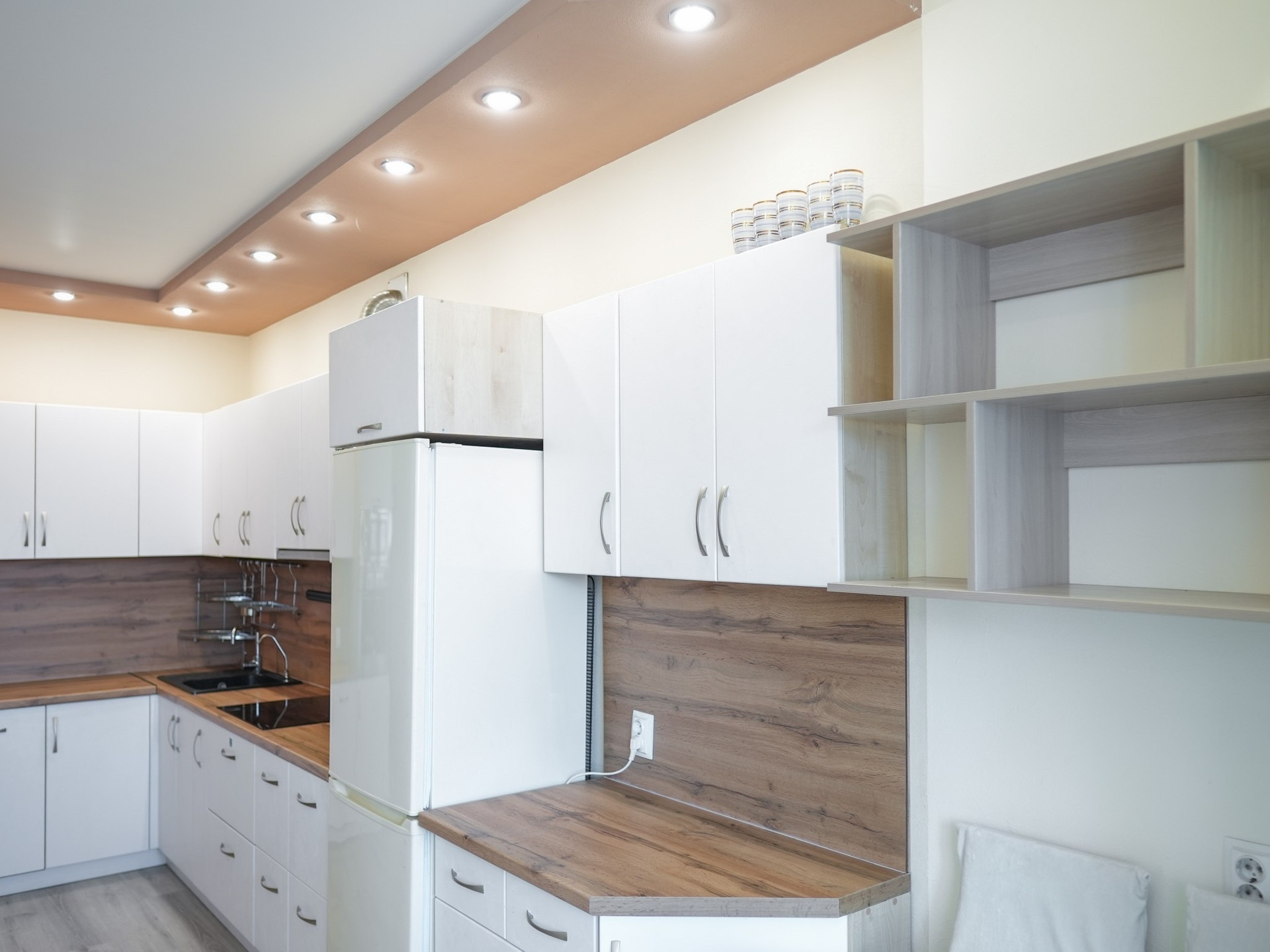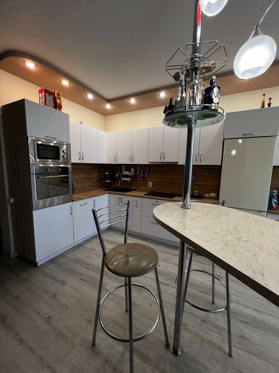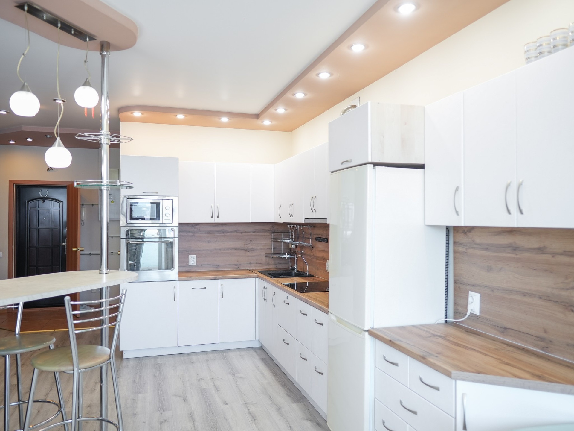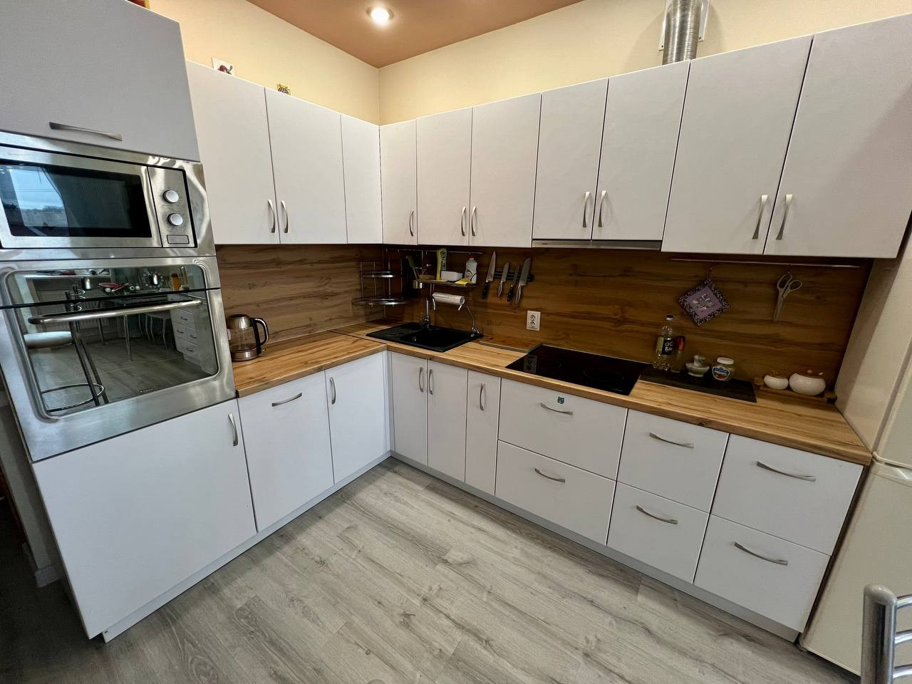 Кухня прошла обновление, заменены столешница, фартук и фасады, установлены доводчики. Под мойкой из искусственного камня установлен трехэлементный фильтр «Аквафор». Имеется встроенная варочная поверхность, духовой шкаф и микроволновая печь.