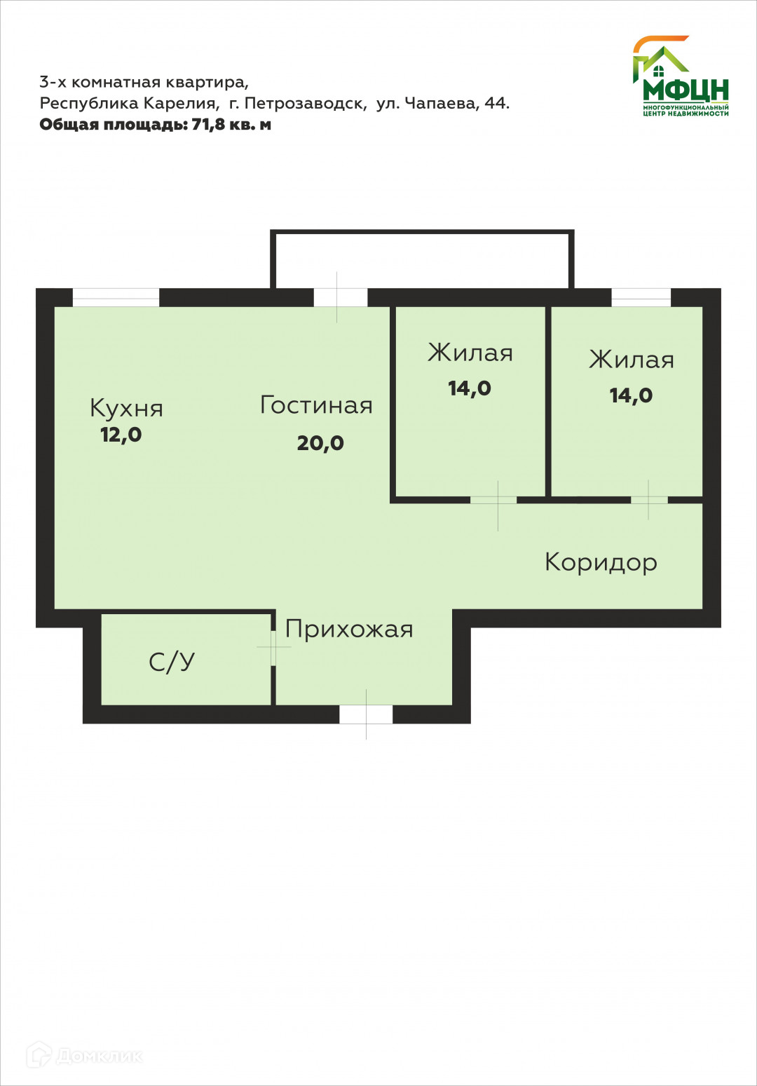 Общая площадь квартиры: 71.8 кв. м.