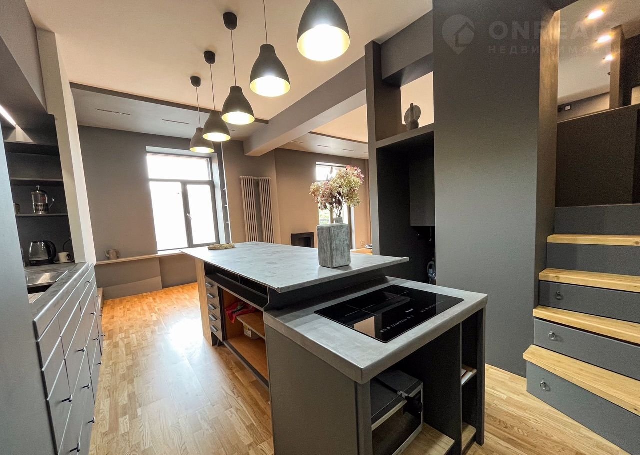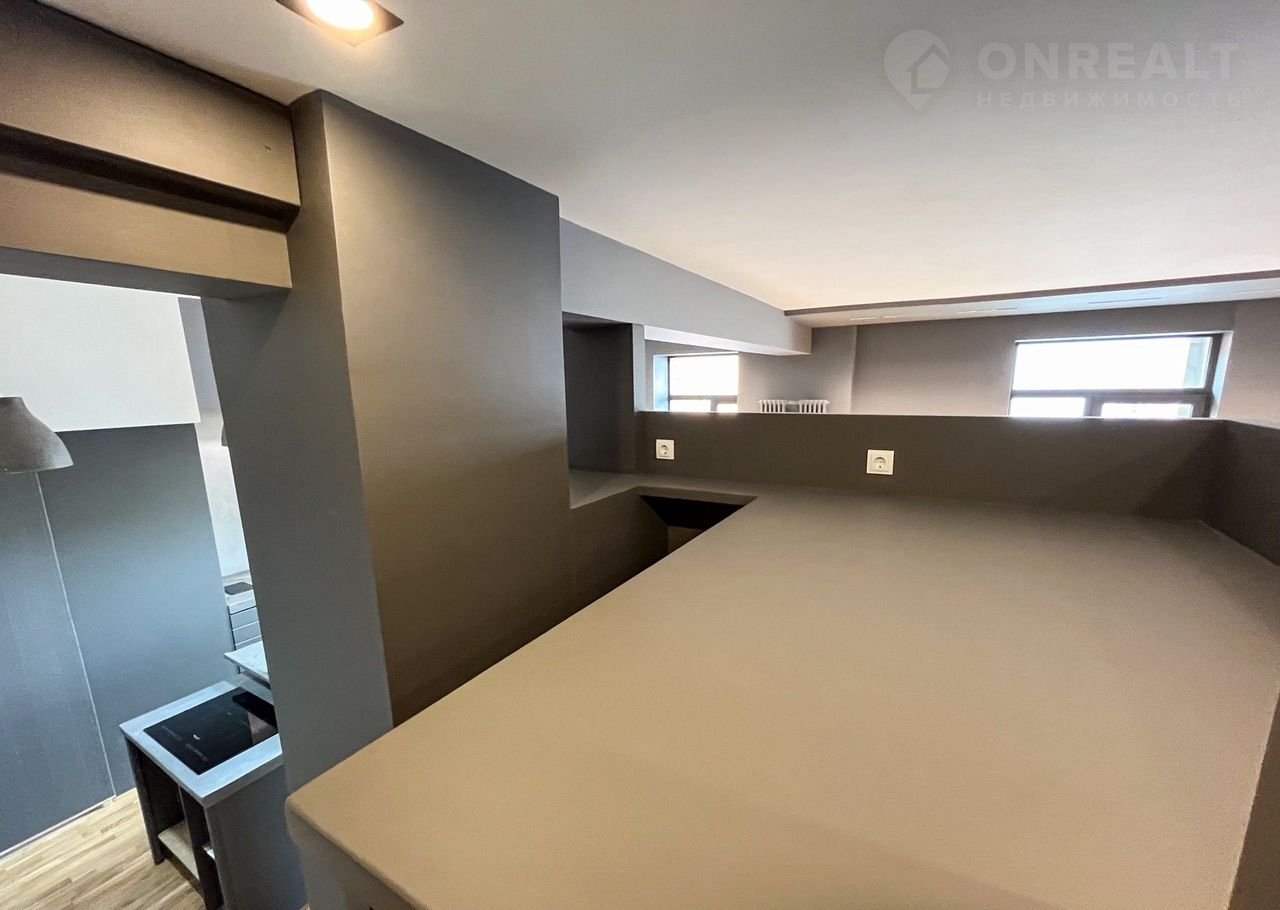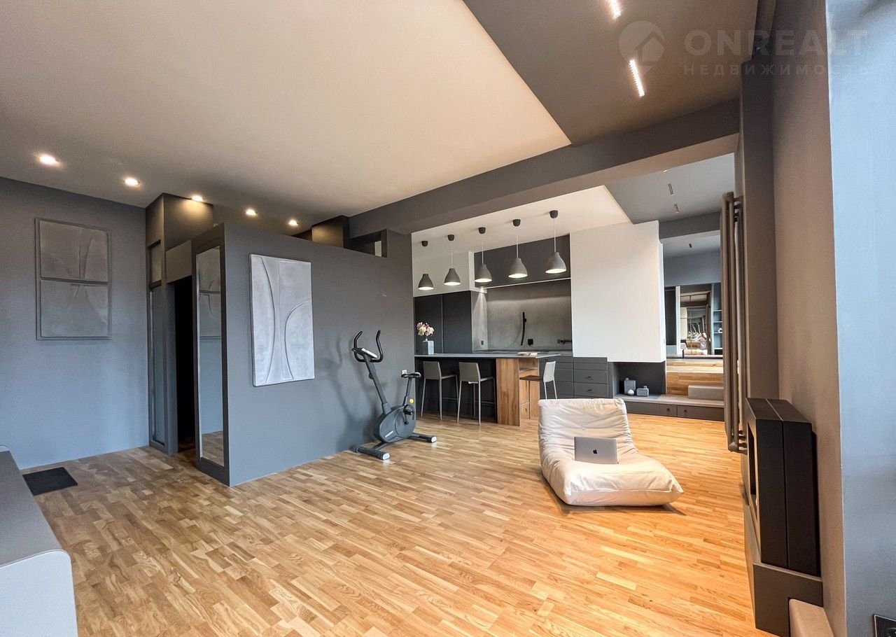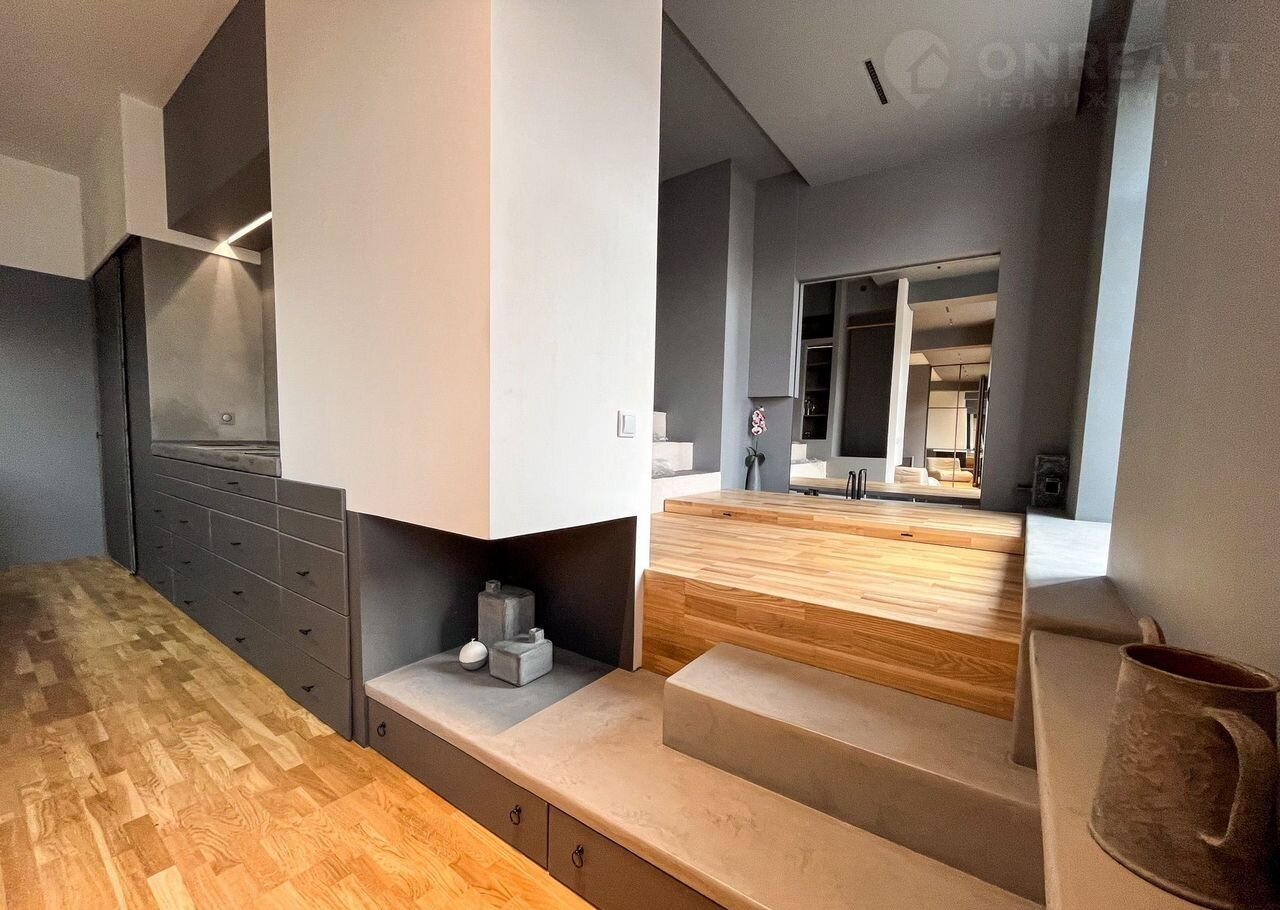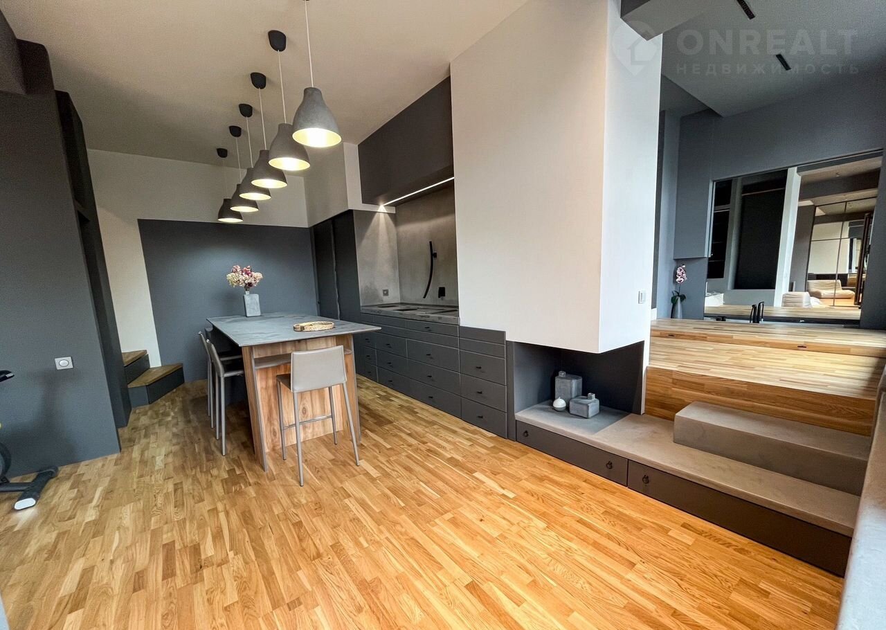 Интерьер выполнен в современном, лаконичном стиле с применением микроцемента, окрашенных поверхностей и дубовой паркетной доски. Стены оснащены качественной шумоизоляцией (50 мм), потолки — гипсокартон. Сохранились оригинальные несущие колонны и балки, придающие пространству архитектурную выразительность.
