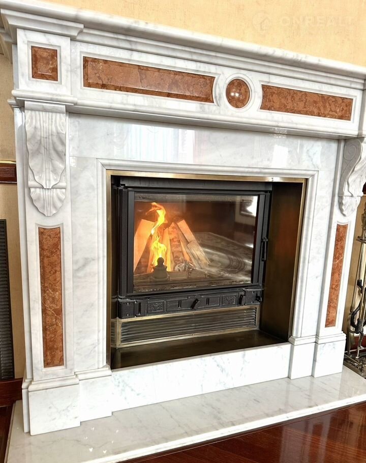 ✅Уютная гостиная с дровяным камином, обрамленным натуральным мраморным порталом (камины изначально в проекте дома), зоной ТВ, вместительным и комфортным диваном; из гостиной выход на балкон с видом на парковую зону - место для утреннего кофе