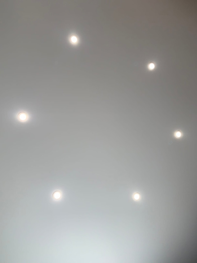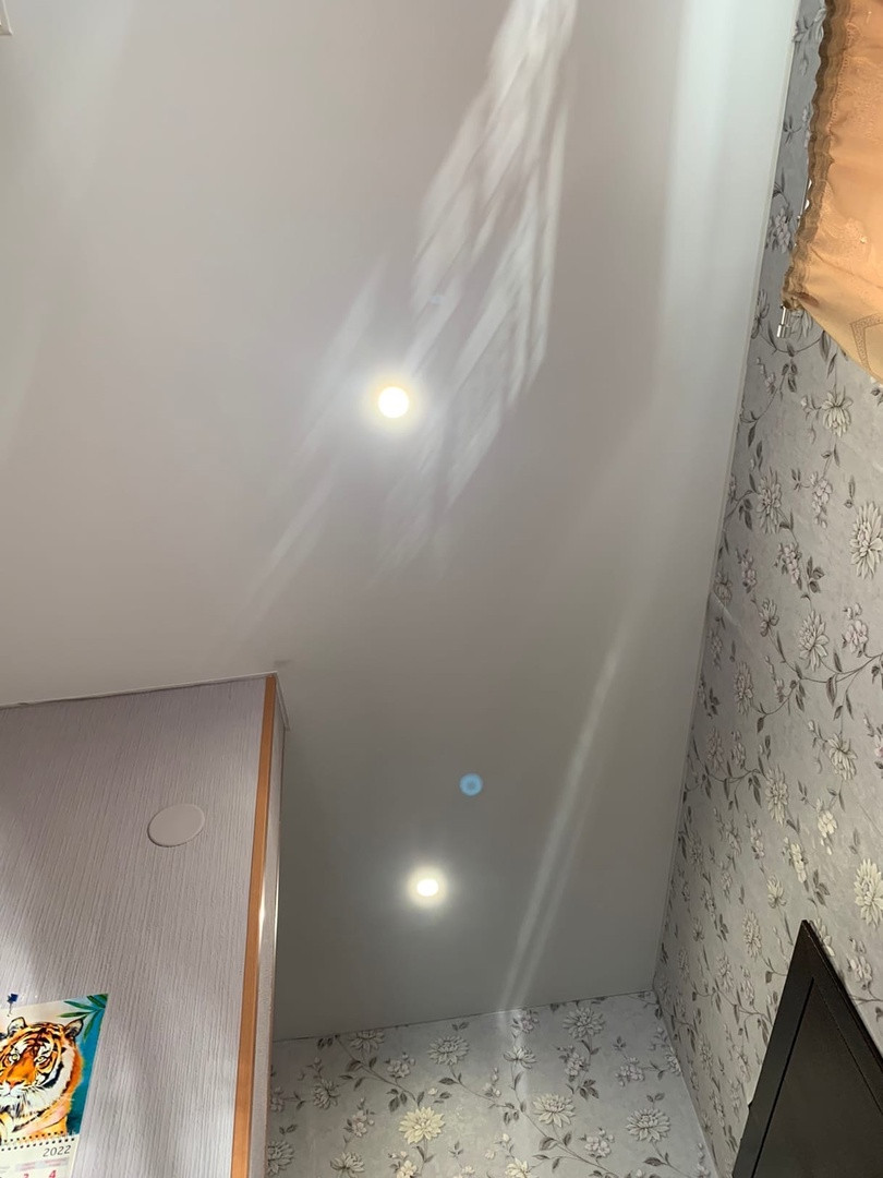 Высокие потолки.Натяжной потолок со встроенными светильниками.