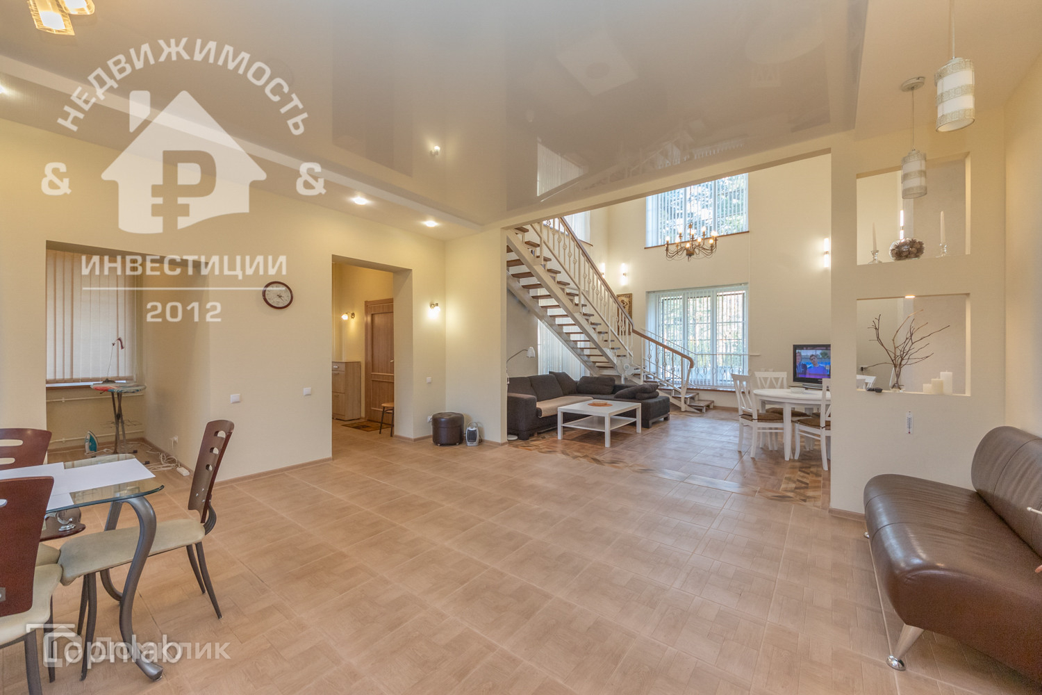 Планировка приложена к фото: первый этаж – огромный гостевой зал (кухня – столовая со встроенным гарнитуром) + большая спальня (30 кв.м.) + комната отдыха + 2 (два) санузла гостевой и большой хозяйский (все выложено плиткой от пола до потолка).